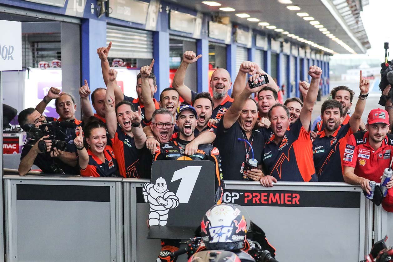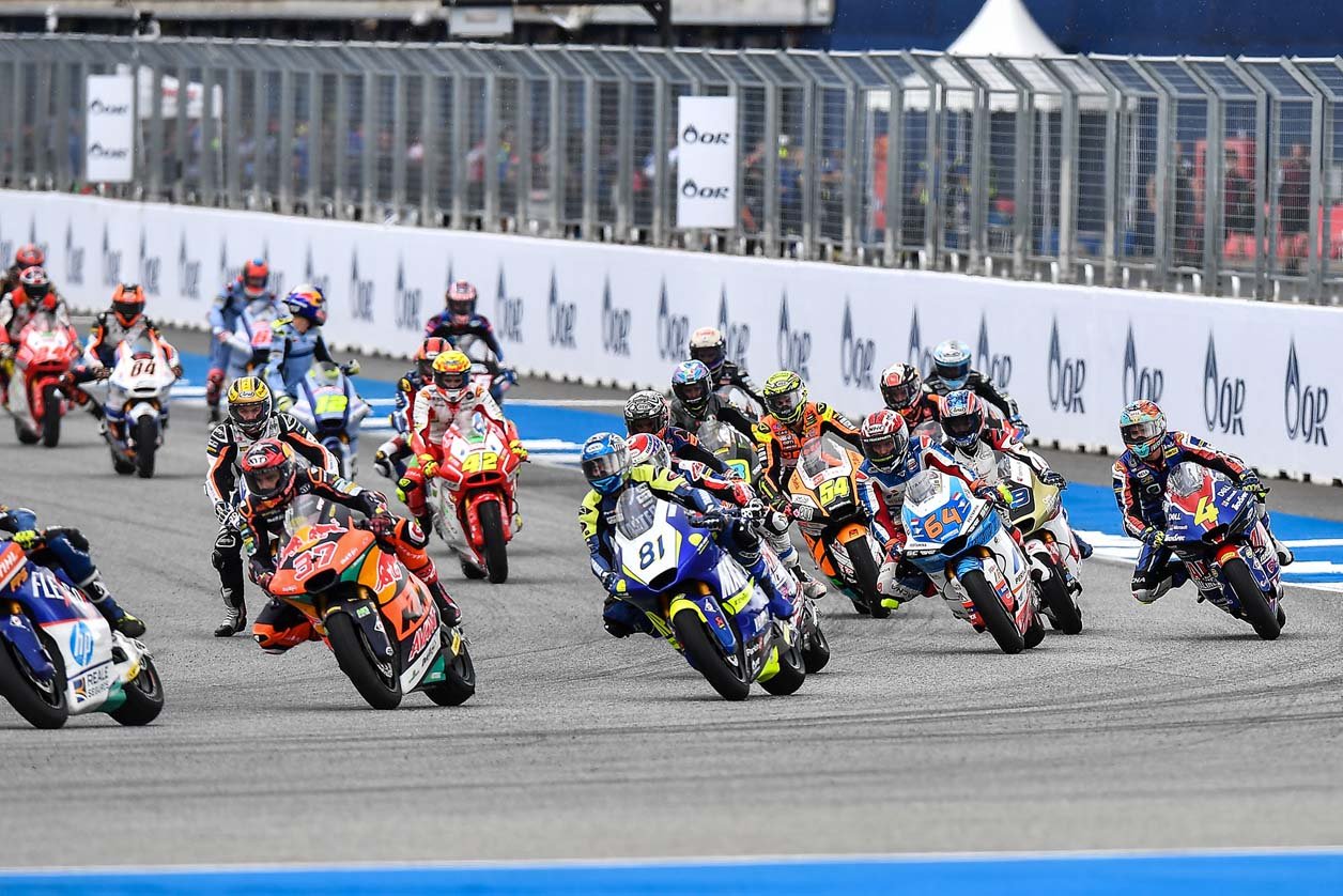ส่วนรุ่นใหญ่อย่าง โมโตจีพี ต้องล่าช้าออกไปกว่า 1 ชั่วโมงจากฝนที่ถล่มลงมาอย่างหนัก แต่แฟนความเร็วชาวไทยก็ไม่ย่อท้อ โดยเรซนี้ต้องดวลในสภาพแทร็กเปียก ผลปรากฏว่า มิเกล โอลิเวียร่า นักบิดโปรตุกีสจาก เรดบูล เคทีเอ็ม แฟ็คตอรี่ เรซซิ่ง ไล่แซงคู่แข่งจากกริดที่ 8 ขึ้นมาคว้าชัยชนะไปอย่างเหนือชั้น ด้วยเวลา 41 นาที 44.503 วินาที เหนือ แจ็ค มิลเลอร์ นักบิดออสเตรเลียนจาก ดูคาติ เลโนโว ทีม อันดับ 2 เพียง 0.730 วินาที ตามด้วย ฟรานเชสโก้ บันยาญ่า รองจ่าฝูงชาวอิตาเลียนในอันดับ 3 ตามหลัง 1.968 วินาที