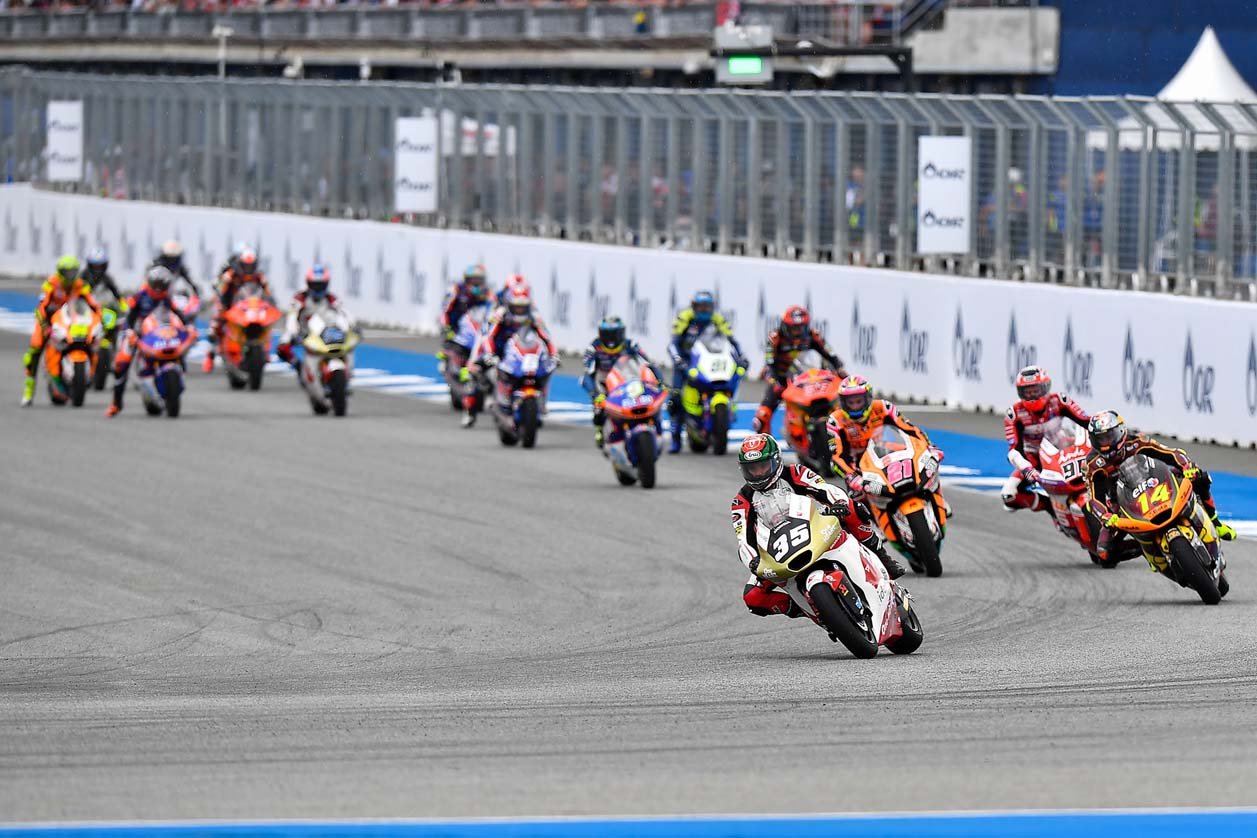 ไฮไลต์การแข่งขันอยู่ในรุ่น โมโตทู ชิงแชมป์โลก ซึ่งมี 2 นักบิดชาวไทยอย่าง “ก้อง” สมเกียรติ จันทรา จาก อิเดมิตสึ ฮอนด้า ทีม เอเชีย และ “เคเคซัง” เขมินท์ คูโบะ จาก ยามาฮ่า วีอาร์46 มาสเตอร์ แคมป์ ลงบิดท่ามกลางเสียงเชียร์กระหึ่มทั่วทั้งสนามของแฟนๆ ชาวไทย