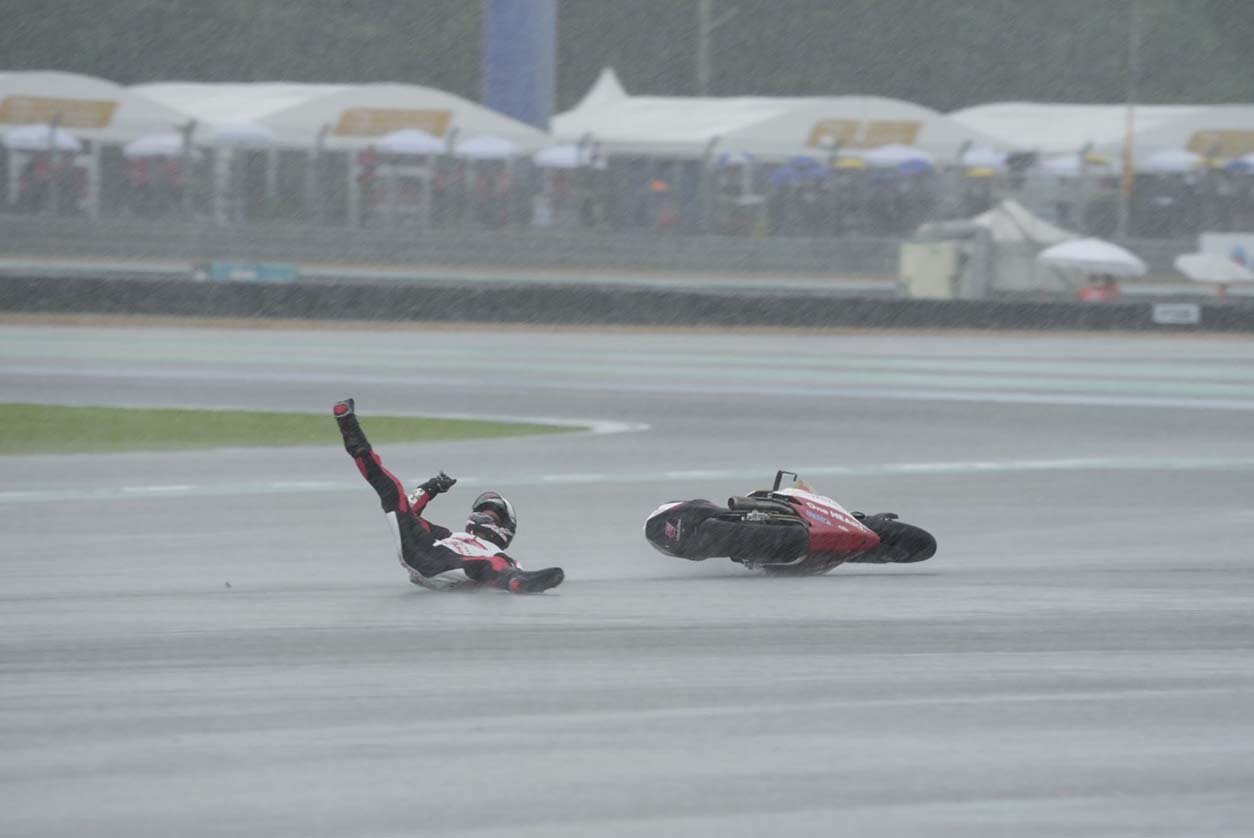 อย่างไรก็ดี ในรอบที่ 2 ก็เกิดเหตุการณ์ดับฝันชาวไทย เมื่อ สมเกียรติ บิดเข้าโค้ง 4 ซึ่งมีปริมาณน้ำบนผิวแทร็กจากฝนที่เทลงมาอย่างหนัก ทำให้ล้มลงไปในโค้งดังกล่าว พลาดโอกาสคว้าชัยชนะในโฮมเรซอย่างน่าเสียดาย ส่วน เขมินท์ ไต่ขึ้นไปถึงอันดับ 9 ก่อนที่กรรมการจะตัดสินใจตีธงแดง เพื่อยุติการแข่งขัน