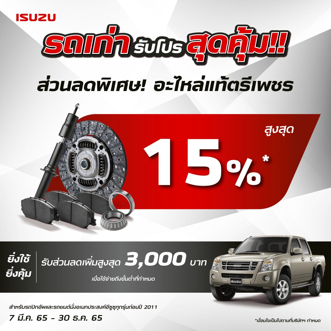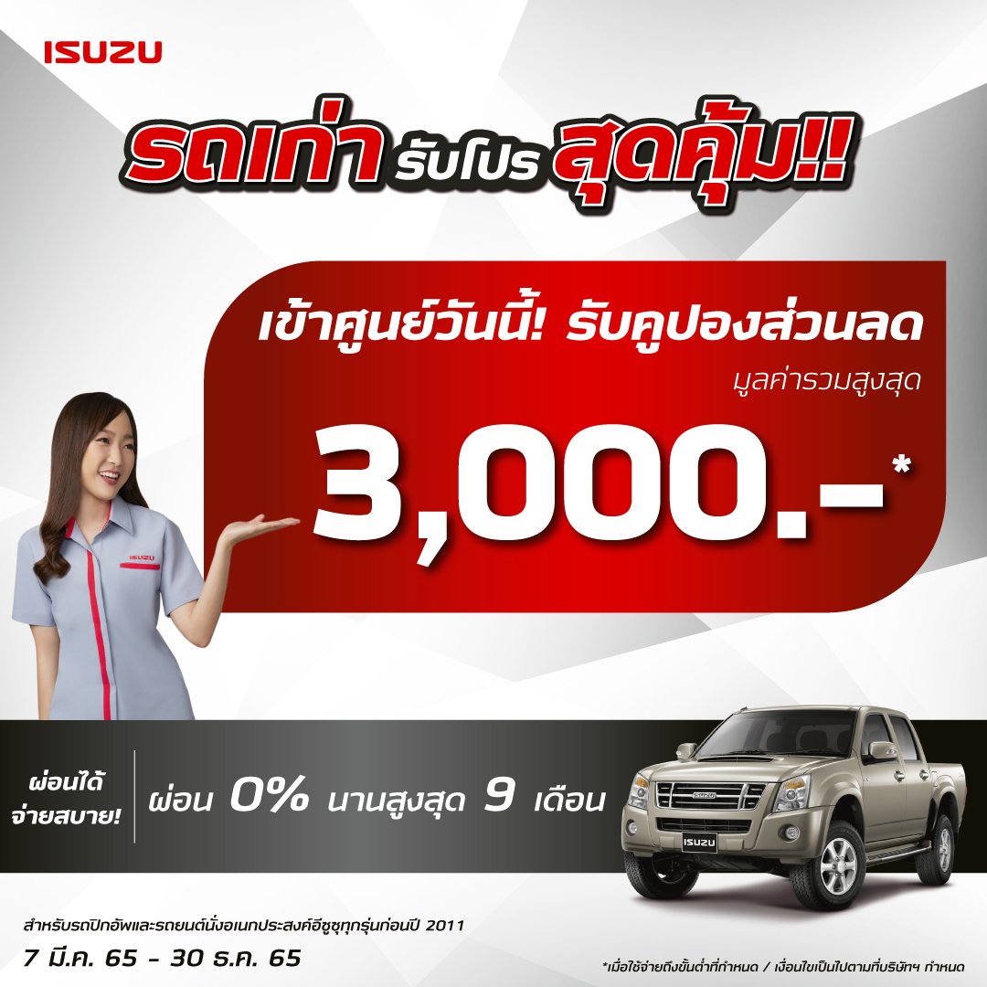 คูปองส่วนลดค่าบริการมูลค่ารวมสูงสุด 3,000 บาท เพียงนำรถอีซูซุคันเก่าของท่านเข้ารับบริการที่ศูนย์บริการมาตรฐานอีซูซุตามเงื่อนไข