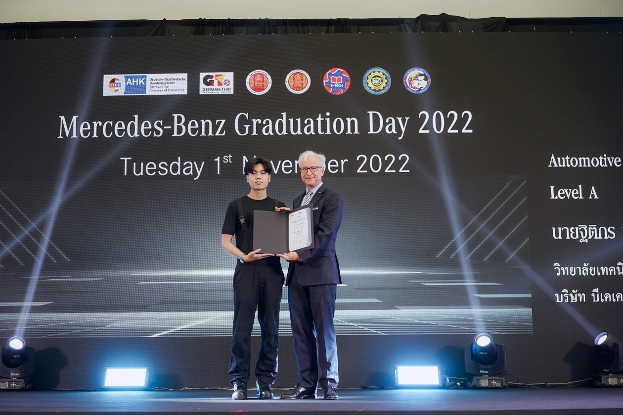 บริษัท เมอร์เซเดส-เบนซ์ (ประเทศไทย) จำกัด จัดพิธีมอบประกาศนียบัตรโครงการนักเรียนช่างฝึกหัดที่ผ่านการรับรองคุณภาพเมอร์เซเดส-เบนซ์ตามมาตรฐานการศึกษาทวิภาคีเยอรมัน ในสาขาวิชาเมคคาทรอนิคส์ยานยนต์เพื่อความเป็นเลิศในการศึกษาทวิภาคีและเพื่อพัฒนาศักยภาพ ของนักเรียนอาชีวะสู่การเป็นช่างเทคนิคมืออาชีพที่ผ่านการรับรองคุณภาพมาตรฐานเดียวกับประเทศเยอรมนี โดยมีประธานในพิธีคือ มร. โรลันด์ โฟล์เกอร์ ประธานบริหาร บริษัท เมอร์เซเดส-เบนซ์ (ประเทศไทย) จำกัด พร้อมด้วยมร. ฮันส์ อูลริช ซึดเบค อัครราชทูตและหัวหน้าฝ่ายเศรษฐกิจ สถานเอกอัคราชทูตเยอรมนีประจำประเทศไทย และ ดร. โรลันด์ ไวน์ ผู้อำนวยการบริหาร หอการค้าเยอรมัน-ไทย ร่วมกับตัวแทนสถาบันการศึกษาที่เข้าร่วมโครงการกับบริษัท เมอร์เซเดส-เบนซ์ (ประเทศไทย) จำกัด