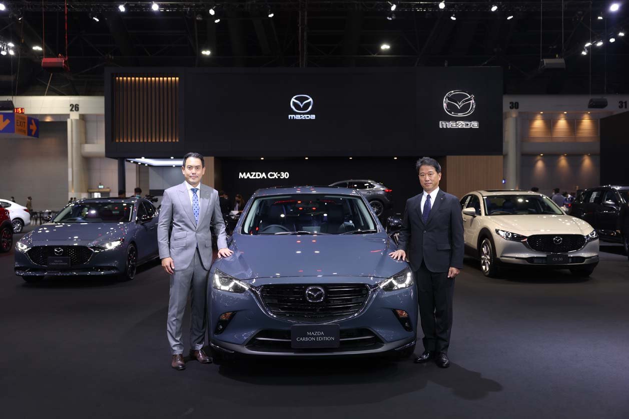 มร. ทาดาชิ มิอุระ ประธานบริหาร พร้อมด้วยคณะผู้บริหารจาก มาสด้า เซลส์ ประเทศไทย ให้การต้อนรับ นายขวัญชัย ปภัสร์พงษ์ ประธาน บริษัท สื่อสากล จำกัด และประธานจัดงาน มอเตอร์ เอ็กซ์โป 2022 พร้อมด้วยคณะผู้จัดงานฯ และคณะสื่อมวลชนกิตติมศักดิ์ ที่ให้เกียรติเข้าร่วมพิธีเปิดบูธแสดงรถยนต์มาสด้า โดยครั้งนี้ มาสด้าได้นำรถยนต์รุ่นพิเศษ Mazda CX-30 Carbon Edition สีเทา แมชชีน เกรย์ มาจัดแสดงเป็นไฮไลท์ให้แฟนๆ ได้ยลโฉมเป็นครั้งแรก พร้อมรถยนต์มาสด้ารุ่นพิเศษ Carbon Edition ในรุ่น Mazda2, Mazda3 และ Mazda CX-3 ทั้งสีเทา โพลีเมทัล เกรย์ และสีเทา แมชชีน เกรย์ รวมถึงทัพรถยนต์มาสด้าทุกรุ่นภายใต้เทคโนโลยีสกายแอคทีฟและการออกแบบอันสง่างามจาก โคโดะ ดีไซน์ มาจัดแสดงในงานฯ ซึ่งจัดขึ้นระหว่างวันที่ 1-12 ธันวาคม 2565 ณ อาคารชาเลนเจอร์ อิมแพ็ค เมืองทองธานี หรือเพียง 12 วัน เท่านั้น