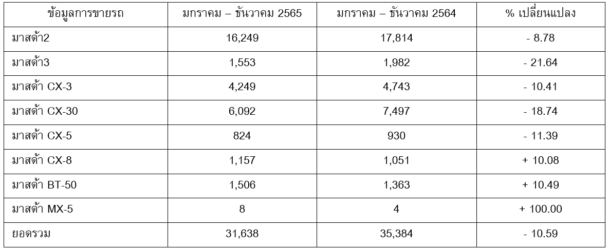 สำหรับมาสด้า แม้ว่าในปีที่ผ่านมาจะตกอยู่ท่ามกลางสงครามการแข่งขันที่ดุเดือด และประสบกับปัญหาการขาดแคลนชิ้นส่วนในการผลิตมาตั้งแต่ต้นปี แต่ยังสามารถประคับประคองยอดขายได้ใกล้เคียงกับเป้าหมายที่วางไว้ โดยเฉพาะรถยนต์นั่งมาสด้า2 ที่ยังคงได้รับความนิยมจากลูกค้าด้วยการสร้างสถิติยอดขายอันดับ 3 ของตลาดบีคาร์รวมอีโคคาร์ ด้วยยอดขายสูงถึง 16,249 คัน และผลักดันให้มาสด้าสามารถครองตำแหน่งยอดขายอันดับ 3 ในตลาดรถยนต์นั่งได้อย่างยาวนานเกินครึ่งทศวรรษ ด้วยจำนวน 17,810 คัน นอกจากนี้ เมื่อเปรียบเทียบยอดขายทั้งปีของตลาดรถอเนกประสงค์เอสยูวีแล้ว มาสด้า CX-Series ยังสามารถสร้างยอดขายได้เป็นกอบเป็นกำที่จำนวน 12,322 คัน อยู่อันดับที่สี่ของเซ็กเมนต์นี้ ส่งผลทำให้ปี 2565 ที่ผ่านมา มาสด้ามียอดขายรวมอยู่ที่ 31,638 คัน ยังคงครองความนิยมด้วยการเป็นแบรนด์ยอดขายอันดับ 6 ของอุตสาหกรรมรถยนต์ไทย