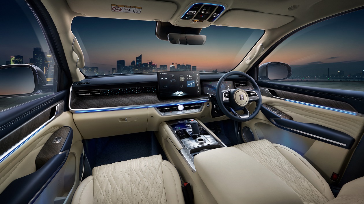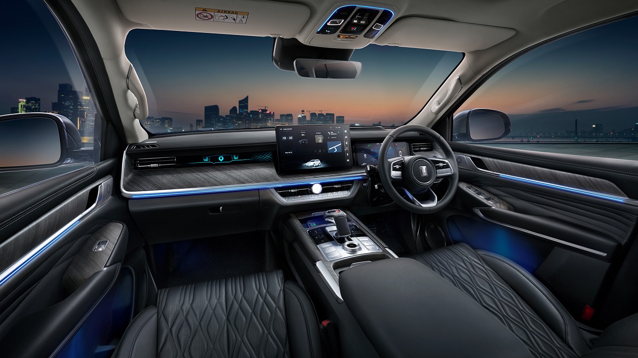All New GWM TANK 500 Hybrid SUV ออกแบบภายในสไตล์ luxury ที่ให้ความรู้สึกหรูหรา กว้างขวาง สะดวกสบาย และการใส่ใจในทุกรายละเอียด ด้วยคอนโซลหน้าสีทูโทน เบาะหนัง NAPPA ลำโพง Infinity และการตกแต่งห้องโดยสารด้วย ambient light, วัสดุสี Black, Silver, Piano Black, Chrome ให้ความเพลิดเพลินในทุกช่วงเวลาการขับขี่