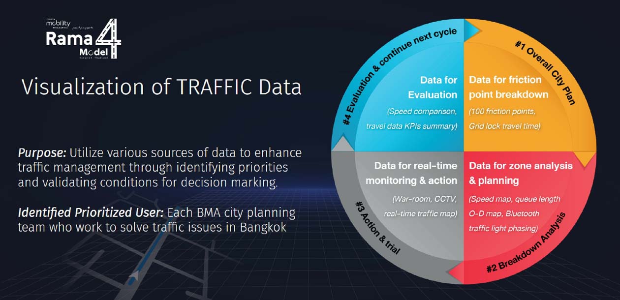 ทีมงานโมเดลพระราม 4 ได้เล็งเห็นถึงศักยภาพของการจัดการจราจรที่ขับเคลื่อนด้วยข้อมูลผ่านโครงการนี้อย่างชัดเจน การใช้ข้อมูลในอดีตสำหรับดูแนวโน้มที่สามารถรองรับการออกแบบโครงสร้างพื้นฐานด้านการจราจร เช่น เวลาเปิด-ปิดสัญญาณไฟ หรือตารางเวลาและเส้นทางของระบบขนส่งสาธารณะได้อย่างชัดเจน นอกจากนี้ข้อมูลแบบเรียลไทม์ที่มีอย่างเหมาะสมก็สามารถช่วยสนับสนุนการจัดการจราจรและบังคับใช้ รวมถึงการจัดการเหตุการณ์ต่างๆ และความผิดปกติที่เกิดขึ้น สิ่งต่างๆ เหล่านี้แสดงให้เห็นถึงความจำเป็นในการที่จะมีแพลตฟอร์มในการแชร์ข้อมูลแบบเปิดมากขึ้นและประสานความร่วมมือของหน่วยงานที่เกี่ยวข้อง