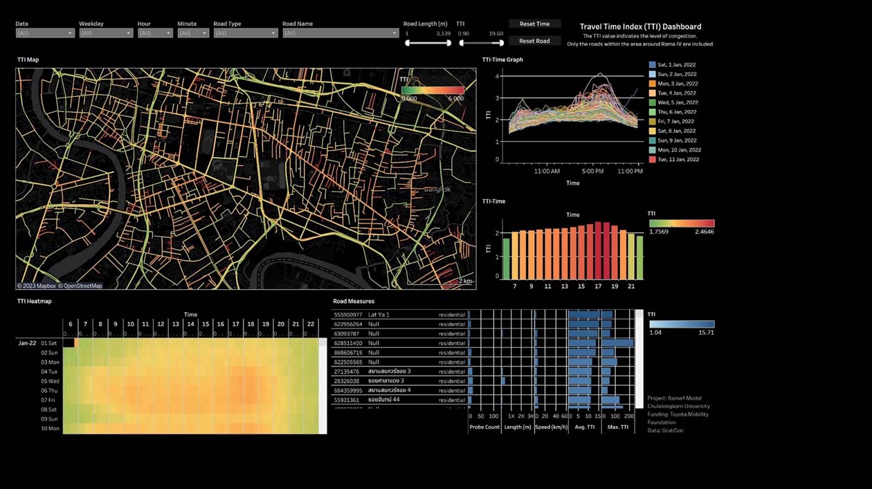ด้วยความเชี่ยวชาญของทีมนักวิจัยของจุฬาลงกรณ์มหาวิทยาลัยและแนวทางการแก้ปัญหาและการจัดการแบบลีน (ลดการสูญเปล่า) ของโตโยต้า เราได้พัฒนา Data Visualization Platforms (รูปที่ 1) เป็นส่วนหนึ่งของวิธีแก้ปัญหาในการวางแผนการจราจรในกรุงแทพ และเพื่อสนับสนุนการจัดการจราจรแบบเรียลไทม์โดยตำรวจจราจร ทีมงานได้พัฒนา "ข้อมูลจราจรแบบเรียลไทม์" (real-time traffic data) หรือ “war room” ซึ่งจะมีข้อมูลจราจรต่างๆ เพื่อทำให้ตำรวจจราจรสามารถมองเห็น เข้าใจสภาพการจราจร ทำให้บริหารจัดการการจราจรได้ดีขึ้น ตัวอย่างของการแสดงภาพจากแพลตฟอร์มใหม่ เช่น