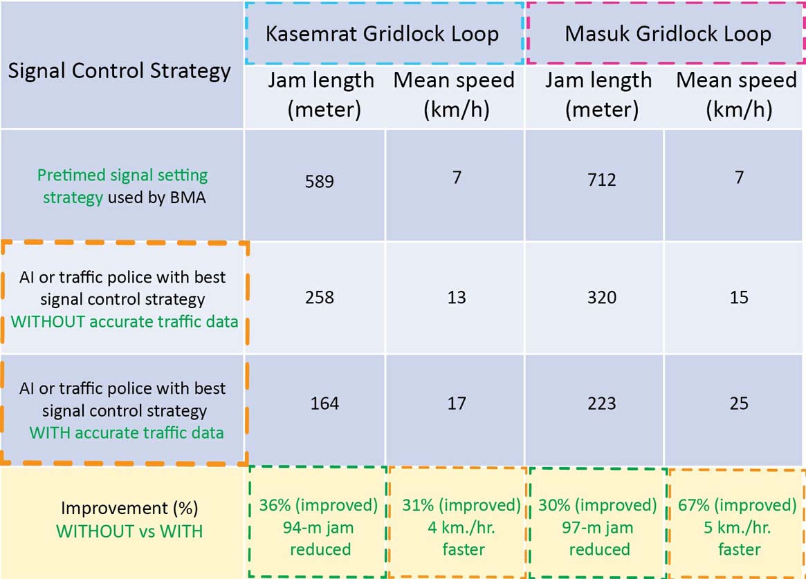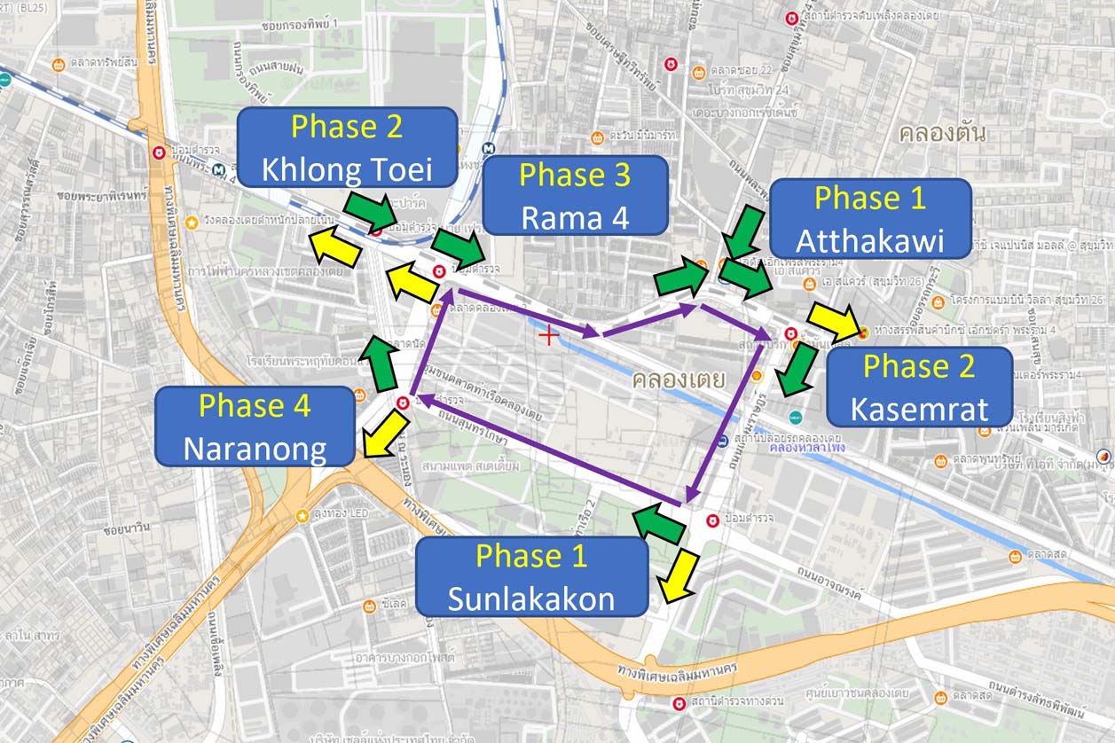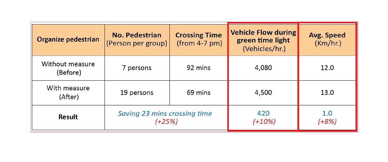 จุดที่เป็นคอขวดคือบริเวณซูเปอร์มาร์เก็ตขนาดใหญ่ย่านอ่อนนุช จากข้อมูลและการวิเคราะห์เชิงคุณภาพ ทำให้ทราบว่ามีสาเหตุมาจากการข้ามทางม้าลายของคนเดินเท้าอยู่ตลอดเวลา และการจอดรถของวินมอเตอร์ไซด์และรถสองแถว (รูปที่ 3) ดังนั้น ในส่วนหนึ่งของการทดลองทางสังคมของเรา จึงดำเนินมาตรการหลักสองประการ ก) จัดระเบียบคนข้ามถนนที่ทางม้าลาย และ ข) ย้ายตำแหน่งที่จอดรถของรถสองแถวให้ห่างจากหน้าซูเปอร์มาร์เก็ตขนาดใหญ่ออกไป ด้วยมาตรการเหล่านี้ เราสามารถลดเวลาการข้ามถนนบนทางม้าลายได้ 23 นาทีในช่วงเวลาเร่งด่วน (15:00-18:00 น.) และทำให้การจราจรคล่องตัวขึ้น 10%
