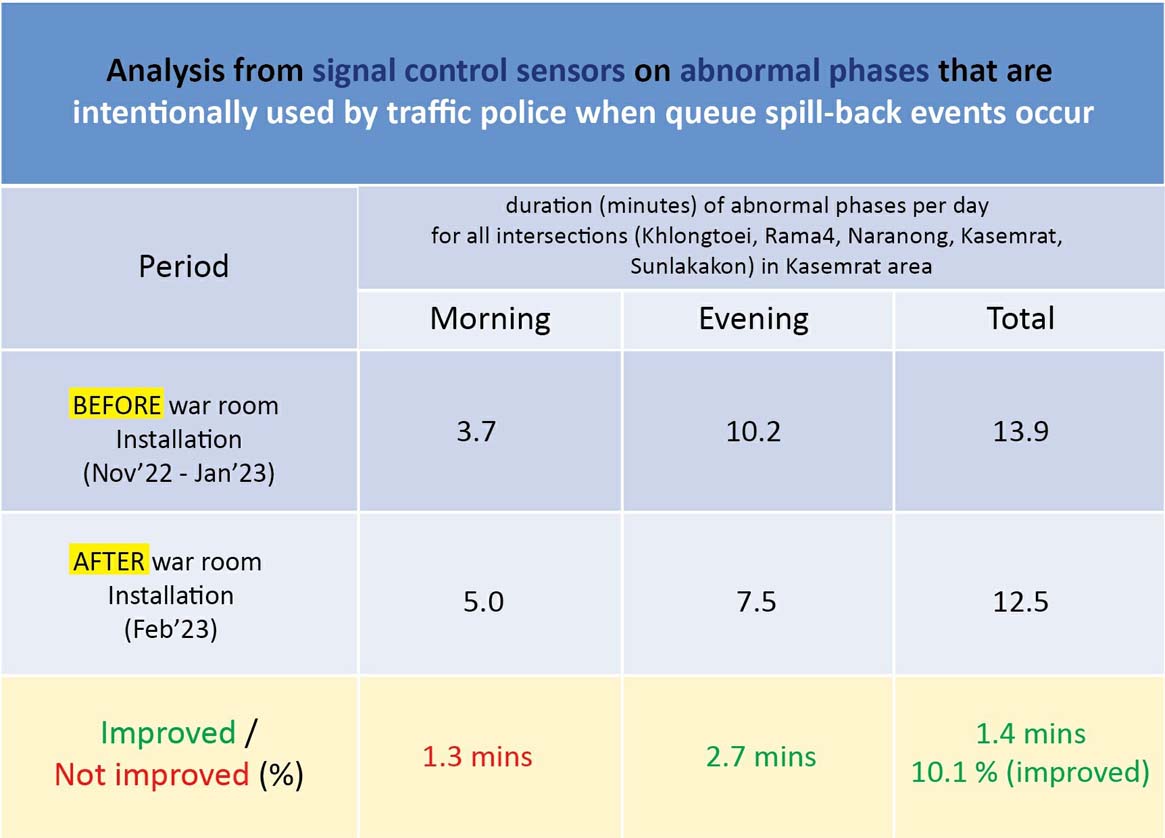 เนื่องจากสภาพทางกายภาพของถนนที่แคบ (เป็นวงเล็กๆ จากแยกม้าศึกไปยังถนนพระราม 4) และมีการตัดกันของกระแสรถที่วิ่งออกมาจากซอยสุขุมวิท 22 และถนนพระราม 4 จึงทำให้เกิดปัญหารถติดขัดบ่อยครั้งในแยกม้าศึกและเกษมราษฎร์ จากการศึกษาสิ่งที่จะช่วยให้การจราจรดีขึ้นคือ การประสานงานกันอย่างมีประสิทธิภาพของตำรวจที่แต่ละแยก ทำให้ตำรวจมีข้อมูลของสภาพการจราจรมากขึ้น เพื่อให้จัดการการจราจรได้ดีขึ้น (รูปที่ 5) ทางโครงการจึงได้จัดกิจกรรม Knowledge Management ด้านการจราจรหลายครั้ง (เพื่อให้การประสานงานระหว่างตำรวจแต่ละแยกให้ดีขึ้น) และติดตั้งจอแสดงข้อมูลการจราจรแบบเรียลไทม์ (รูปที่ 6) ตลอดพื้นที่พระราม4 (เช่น ข้อมูลสัญญาณไฟจราจร ข้อมูลอุบัติการณ์ต่างๆ แผนที่สภาพการจราจร และกล้องวงจรปิด) ส่งผลให้เราสามารถลดระยะเวลาความผิดปกติของการเปิดสัญญาณไฟโดยเฉลี่ย 10% ต่อวัน (รูปที่ 7)