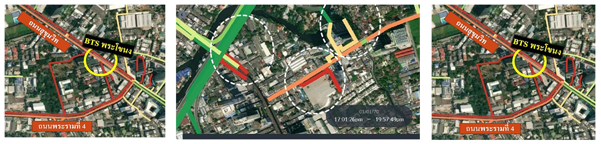 • Historical Speed Map : แสดงข้อมูลความเร็วในอดีต ช่วยให้วิเคราะห์ตามโซนและถนนแต่ละเส้นได้ สามารถเลือกแสดงผลได้จาก 3 ตัวเลือก 1) Free-Flow Speed (FFS), 2) Travel Time Index (TTI) และ 3) Road Segment Speed