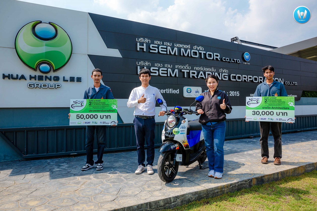 จากภาพ คุณมัญชรี สงเคราะห์ กรรมการผู้จัดการ บริษัท เอช เซม มอเตอร์ จำกัด (คน 2 จากขวา) ถ่ายภาพร่วมกับอาจารย์ และนักศึกษาคณะวิศวกรรมศาสตร์ มหาวิทยาลัยเทคโนโลยีราชมงคลกรุงเทพ ผู้ได้รับรถมอเตอร์ไซค์ไฟฟ้า เอช เซม คันต้นแบบ (Prototype) ไปศึกษาและพัฒนาจนสามารถคว้ารางวัลรองชนะเลิศอันดับ 1 ในประเภทสถาบันการศึกษา และรางวัล Architecture ในโครงการแข่งขันรถจักรยานยนต์ไฟฟ้าดัดแปลงเพื่อธุรกิจครั้งที่ 2 ซึ่งจัดขึ้นโดยสมาคมยานยนต์ไฟฟ้าไทยร่วมกับการไฟฟ้าฝ่ายผลิตแห่งประเทศไทย และยังเป็นการเตรียมความพร้อมด้านองค์ความรู้เกี่ยวกับยานพาหนะพลังงานไฟฟ้า เพื่อรองรับการเติบโตของอุตสาหกรรมยานพาหนะพลังงานไฟฟ้าในอนาคต