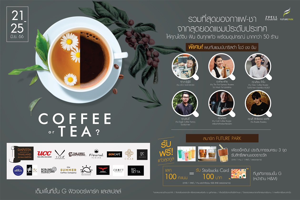 ศูนย์การค้าฟิวเจอร์พาร์ค และสเปลล์ ผนึกกำลังกับ “สมาคม Barista Association of Thailand” ชวนสัมผัสประสบการณ์จิบ ฟิน อินทุกแก้ว สำหรับคอเครื่องดื่มกาแฟ ชา ในงาน “Coffee Or Tea 2023” ยกทัพกาแฟ ชา จากสุดยอดแชมป์ระดับประเทศ พร้อมอุปกรณ์กว่า 50 ร้าน ให้ผู้เข้าร่วมงานได้ทดลองดื่มและสัมผัสกับความพิเศษของรสชาติอันเป็นเอกลักษณ์เฉพาะของบาริสต้าในแต่ละร้าน นอกจากนี้ยังมีกิจกรรมสุด Exclusive สำหรับผู้เข้าร่วมงานกับการโชว์ ชง ชิม จากแชมป์บาริสต้าระดับประเทศ ไม่ว่าจะเป็น