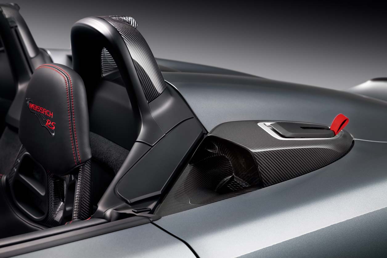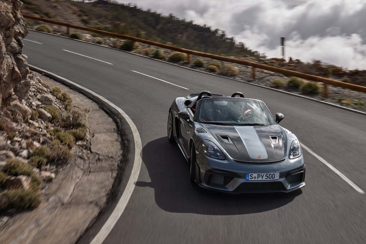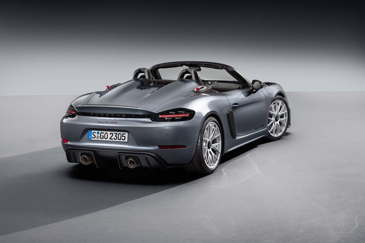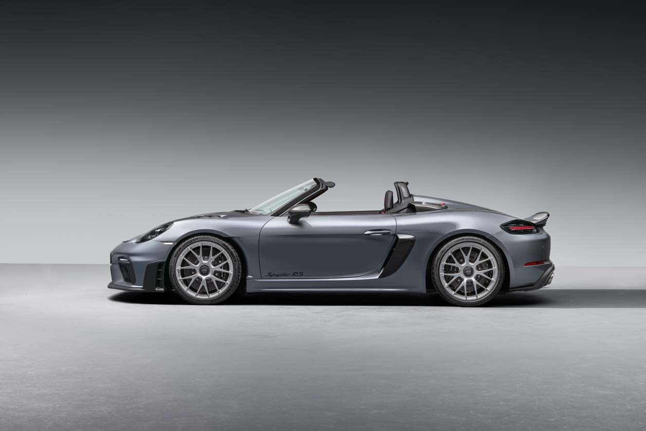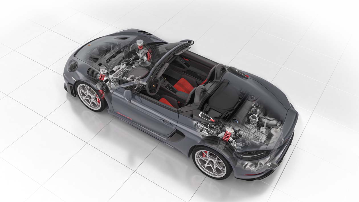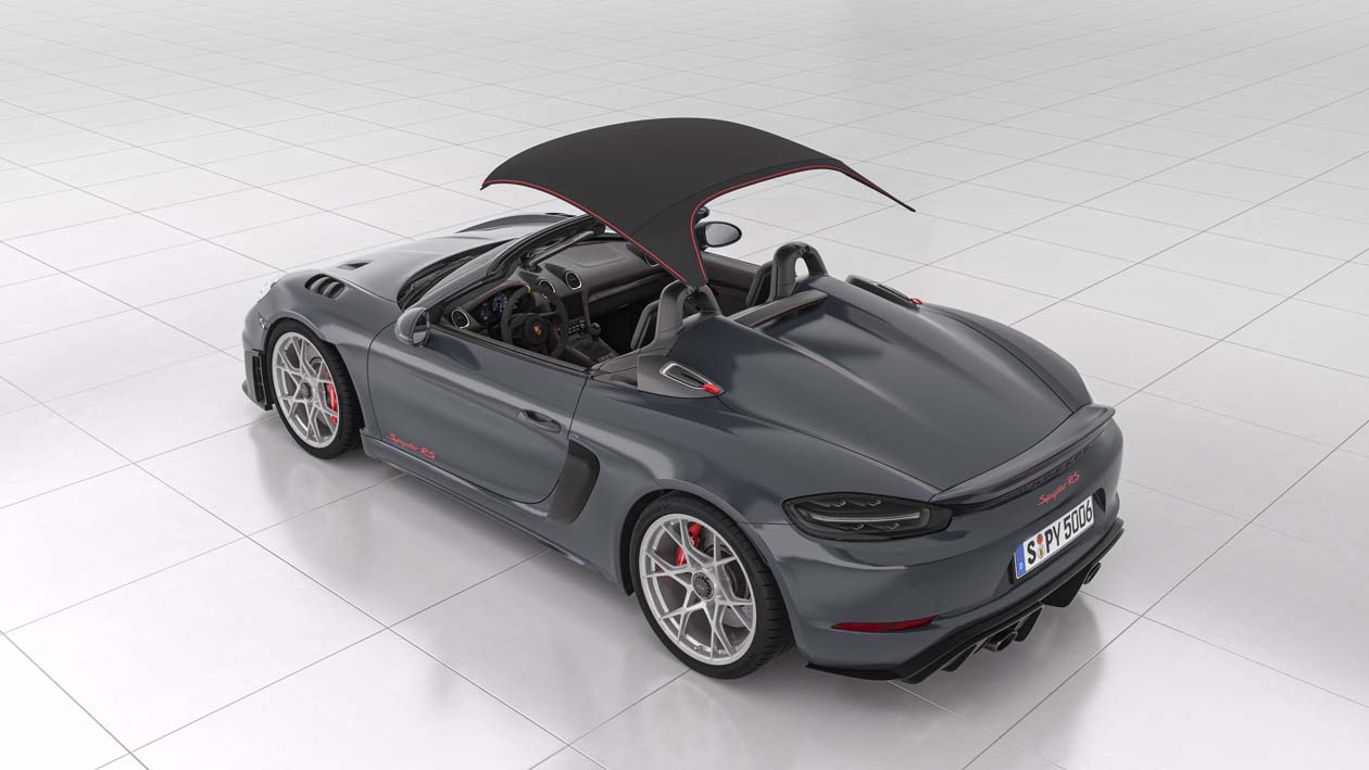 718 Spyder RS เป็นรถคู่แฝดของ 718 Cayman GT4 RS ที่ให้พละกำลังสูงสุดกว่า 368 kW (500 PS) เครื่องยนต์ถูกวางในตำแหน่งกลางลำรถสปอร์ตเปิดประทุน (The open-topped mid-engine sports car ) ซึ่งเป็นเครื่องยนต์รอบสูงและมีน้ำหนักเบา บล็อกเดียวกับรถแข่งตัวแรงอย่าง 911 GT3 Cup โดยน้ำหนักส่วนเกินถูกรีดออกจนเบาเป็นพิเศษ ใช้หลังคาประทุนแบบ soft-top กางและเก็บด้วยระบบแมนวล 718 Spyder RS มาพร้อมเสียงเครื่องยนต์ที่ดุดันจากท่อไอเสียสแตนเลสน้ำหนักเบา ทั้งยังเพิ่มความโหดด้วยช่องรับอากาศขนาดใหญ่ ทั้งแนวด้านข้างตัวถัง และบริเวณหลังพนักพิงศีรษะ