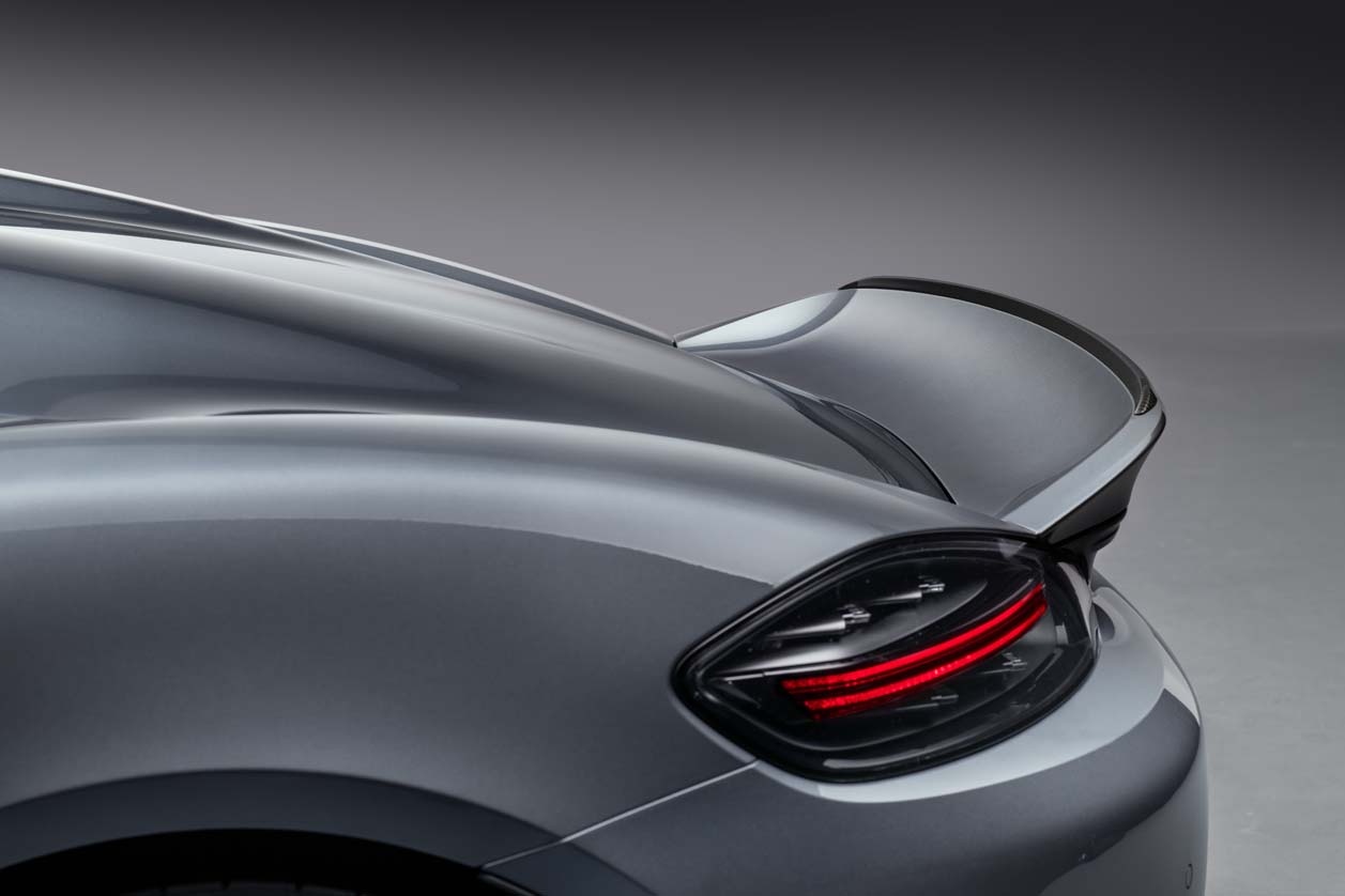 ตัวถังด้านหน้าของ 718 Spyder RS แทบจะไม่แตกต่างจาก 718 Cayman GT4 RS ฝากระโปรงหน้าผลิตจากวัสดุคาร์บอนไฟเบอร์ (CFRP) เพิ่มขนาดของช่องดักอากาศบนกันชนหน้าให้ใหญ่ขึ้น ครีบดักอากาศ NACA ทั้งสองฝั่ง ทำหน้าที่ระบายความร้อนให้แก่ระบบเบรกได้อย่างมีประสิทธิภาพ โดยไม่ส่งผลกระทบต่อค่าสัมประสิทธิ์แรงเสียดทาน (Coefficient of Drag) ครีบ Sideblades บริเวณมุมกันชน มีส่วนช่วยในการสร้างแรงกด ลิ้นสปอยเลอร์หน้ามีขนาดสั้นกว่าของ 718 Cayman GT4 RS เล็กน้อย เมื่อประสานการทำงานกับปีกหลังขนาดใหญ่ สามารถสร้างแรงกดโดยรวมสูงกว่า Cayman การเลือกเพิ่มขนาดของลิ้นสปอยเลอร์ เพื่อเสริมความสมดุลทางแอร์โร่ไดนามิคแทนการใช้ปีก ส่งผลให้รูปทรงของ 718 Spyder RS มีเหลี่ยมมุมที่เฉียบคมในสไตล์ ducktail อุปกรณ์ด้านอากาศพลศาสตร์ทั้งหมดล้วนถูกดีไซน์ให้ทำงานร่วมกัน เพื่อสร้างสมดุลระหว่างแรงยกและแรกกดบนตัวถัง รวมทั้งให้เสถียรภาพสูงสุดขณะขับขี่ในทุกย่านความเร็ว