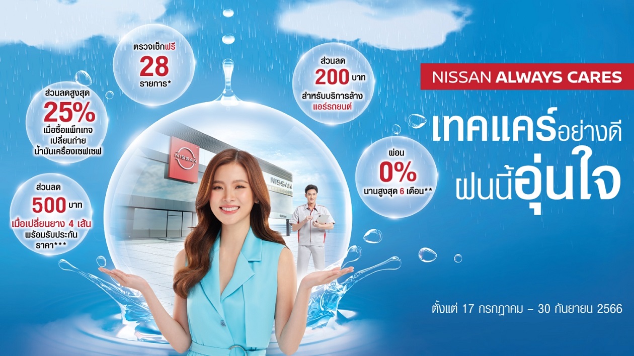 นิสสัน ประเทศไทย ส่งความห่วงใยช่วงหน้าฝน ชวนลูกค้านำรถเข้ารับบริการตรวจเช็กสภาพรถเพิ่มความมั่นใจในการใช้รถยนต์ในช่วงฤดูฝนกับโปรโมชันพิเศษผ่านแคมเปญ “NISSAN ALWAYS CARES เทคแคร์อย่างดี ฝนนี้อุ่นใจ” ด้วยโปรโมชันตรวจเช็กสภาพรถยนต์ฟรี 28 รายการ พร้อมส่วนลดพิเศษอื่น ๆ อีกมากมาย ตั้งแต่วันที่ 17 กรกฎาคม - 30 กันยายน 2566
