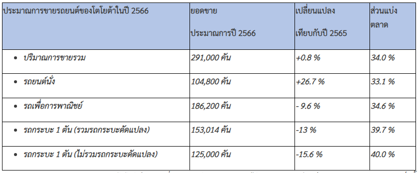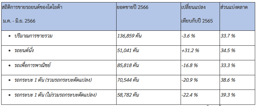 “สำหรับผลการดำเนินงานของโตโยต้าในช่วงครึ่งแรกของปี 2566 มียอดขายโดยรวมอยู่ที่ 136,859 คัน ลดลง 3.6% ยังคงมีส่วนแบ่งทางการตลาดเป็นอันดับ 1 หรือเท่ากับ 33.7% ของยอดขายรถยนต์ทั้งหมด ส่วนหนึ่งเป็นผลมาจากความนิยมและยอดขายรถยนต์โตโยต้าในตลาดรถยนต์นั่งที่เติบโตขึ้นถึง 31.2% โดยเฉพาะอย่างยิ่งในกลุ่มรถอีโคคาร์ที่ยังคงสามารถครองส่วนแบ่งทางการตลาดเป็นอันดับ 1 ได้อย่างต่อเนื่อง ในขณะที่ในตลาดรถเพื่อการพาณิชย์นั้นก็ยังสามารถรักษาระดับยอดขายได้อยู่ในระดับที่น่าพอใจ ถึงแม้ว่าสถานการณ์โดยรวมของตลาดรถเพื่อการพาณิชย์ในช่วงครึ่งปีแรกนี้จะเกิดการชะลอตัวลงก็ตาม”
