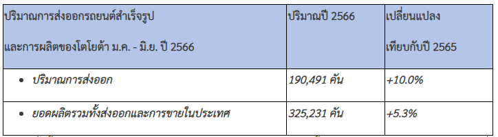 สำหรับปริมาณการส่งออกของโตโยต้าในช่วงครึ่งแรกของปี 2566 บริษัทฯ ได้ส่งออกรถยนต์สำเร็จรูปจำนวน 190,491 คัน เพิ่มขึ้น 10% จากช่วงเวลาเดียวกันของปีที่ผ่านมา โดยยอดการผลิตสำหรับการขายภายในประเทศและการส่งออกมีจำนวนรวมทั้งสิ้น 325,231 คัน เพิ่มขึ้น 5.3% จากปีที่แล้ว
