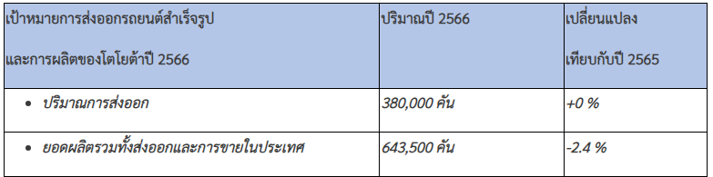 ทั้งนี้ สำหรับเป้าหมายการส่งออกรถยนต์สำเร็จรูปของโตโยต้าในปีนี้ คาดการณ์ว่าปริมาณการส่งออกจะอยู่ที่ ประมาณ 380,000 คัน เทียบเท่าปีที่แล้ว โดยเป็นผลจากภาวะเศรษฐกิจและกำลังซื้อของประเทศคู่ค้าที่ชะลอตัวลง ส่งผลให้ปริมาณการผลิตรถยนต์ของโตโยต้าในปี 2566 อยู่ที่ระดับ 643,500 คัน หรือลดลง 2.4% จากปีที่แล้ว ซึ่งสอดคล้องกับเป้าหมายการขายของทั้งในประเทศและส่งออก