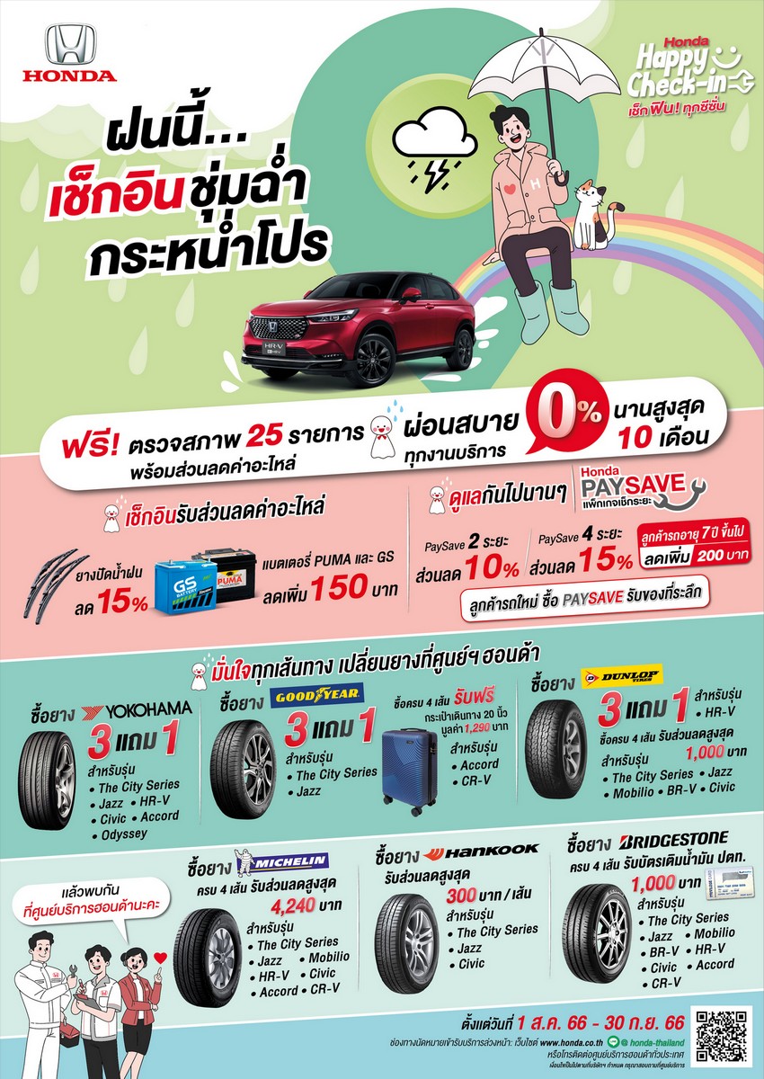 บริษัท ฮอนด้า ออโตโมบิล (ประเทศไทย) จำกัด ออกแคมเปญ “ฝนนี้…เช็กอินชุ่มฉ่ำ กระหน่ำโปรฯ” ด้วยบริการตรวจเช็กสภาพรถยนต์ฟรี 25 รายการ รวมทั้งมอบข้อเสนอพิเศษเฉพาะลูกค้าฮอนด้า ซึ่งมาพร้อมเงื่อนไขตามที่บริษัทฯ กำหนด ทั้งโปรโมชันยาง ซื้อ 3 เส้น แถม 1 เส้น อาทิ ยางโยโกฮาม่า (Yokohama) หรือยางกู๊ดเยียร์ (Goodyear) หรือยางดันลอป (Dunlop) ส่วนลดยางปัดน้ำฝน 15% ส่วนลดแบตเตอรี่ทางเลือกคุณภาพสูงยี่ห้อพูม่า (PUMA) และจีเอส (GS) รวมถึงส่วนลดแพ็กเกจเช็กระยะฮอนด้าเพย์เซฟ (Honda PaySave) โดยสามารถผ่อนชำระค่าใช้จ่ายงานบริการดอกเบี้ย 0% นาน 6 เดือน สำหรับบัตรเครดิตธนาคารที่ร่วมรายการ และสูงสุด 8 เดือน เฉพาะบัตรเครดิตกรุงศรีเฟิร์สช้อยส์ และค่าใช้จ่ายยางรถยนต์นานสูงสุด 10 เดือน เพียงนัดหมายและนำรถยนต์เข้ารับบริการที่ศูนย์บริการฮอนด้าทั่วประเทศ ตั้งแต่วันที่ 1 สิงหาคม 2566 – 30 กันยายน 2566