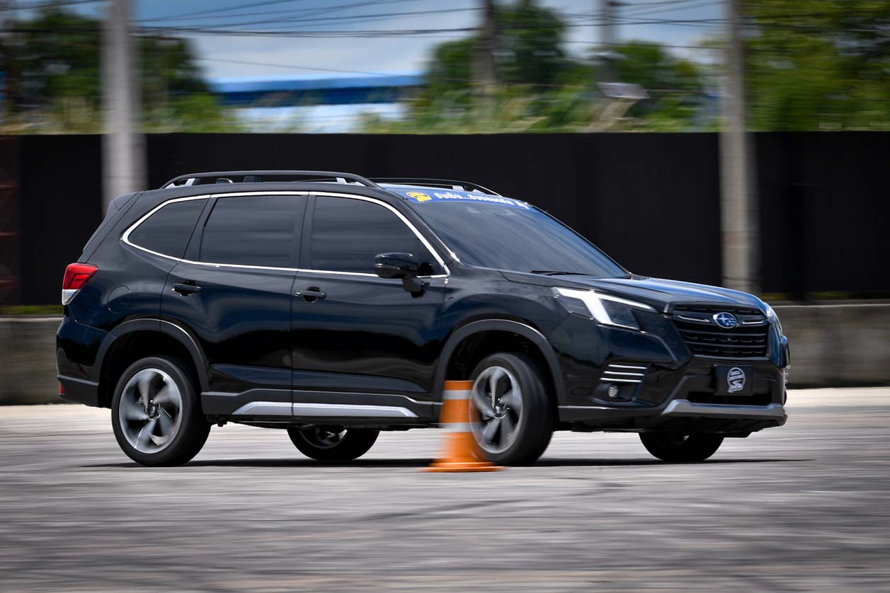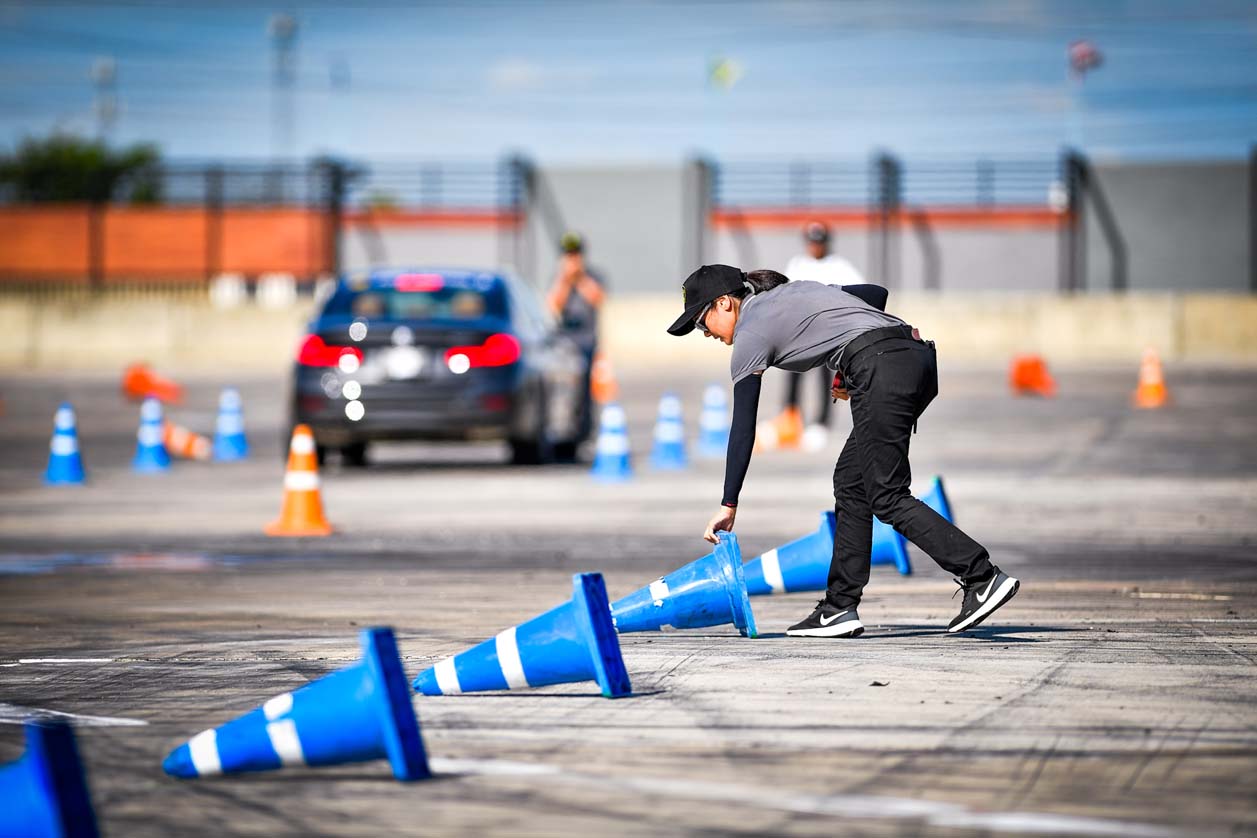 โดยเราจะขับรถวิ่งตรงเข้ามาถึงกรวยตัวแรกเพื่อหักหลบไปทางซ้าย แล้วเหยียบเบรกอย่างเต็มที่ พร้อมหักหลบอีกครั้งไปในทิศทางขวามือ โดยในรอบแรก เราใช้ความเร็วอยู่ที่ราวๆ 70 กม./ชม. เป็นการจำลองการแก้ไขเหตุฉุกเฉินเฉพาะหน้าที่เราต้องหักหลบโดยไม่เบรกในขณะใช้ความเร็วสูง จากนั้นก็เบรคอย่างเต็มที่ก่อนจะหักหลบไปอีกทิศทางหนึ่ง หลังจากนั้นเราก็จะเพิ่มความเร็วให้สูงขึ้น โดยเราจะฝึกการใช้สายตาที่ต้องมองหาช่องทางที่จะพารถหลบออกไป แต่ถ้าเรามองแค่ในระยะใกล้ๆ การกะระยะและทิศทางจะผิดพลาด อาจชนกับกรวยที่ตั้งไว้ สายตามองไปทางไหน เราก็จะพารถไปทางนั้น ดังนั้นเราต้องออกไปในทิศทางที่จะพารถออกไปทางที่ปลอดภัยเสมอ และต้องมองล่วงหน้าไกลๆ ไม่ใช่มองแค่ระยะหน้ารถ นอกจากนี้ยังต้องหมุนพวงมาลัยด้วยความรวดเร็ว แม่นยำและนุ่มนวล เพื่อไม่ให้รถเสียอาการ เราได้ฝึกขับกันหลายรอบจนคุ้นเคยและกะระยะในการหักเลี้ยว เบรก ได้เป็นอย่างดี ก่อนที่จะเปลี่ยนไปฝึกในสถานีต่อไป