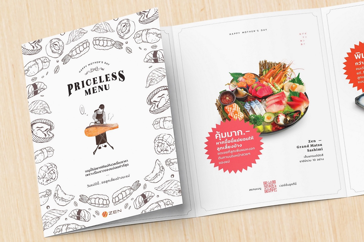 โดยครั้งนี้ ZEN ขอใช้พื้นที่ที่ร้านอาหารจริง ตอบแทนแม่ทุกคนด้วยการหยิบอินไซต์ที่ว่า แม่ ๆ ไม่ค่อยยอมให้ลูกเลี้ยงข้าว ซึ่งเวลาเห็นราคาอาหาร ไม่ว่าเท่าไหร่ก็บ่นว่าแพงไว้ก่อน ซึ่งแท้จริงแล้วเกิดจากการเป็นห่วงลูก ไม่อยากให้ลูกเปลืองเงิน ดังนั้น ZEN ขอแก้ปัญหาคลาสสิค ด้วยการครีเอตเมนูเล่มพิเศษเฉพาะวันแม่ ‘Priceless Menu เมนูนี้ไม่อยากให้แม่กังวลเรื่องราคา เพราะ story ของแม่เลอค่าที่สุด’ ซึ่งพิเศษตรงที่ เมนูนี้จะ ‘ซ่อน’ ราคาอาหาร ไม่ให้แม่เห็น แต่เปลี่ยนเป็น Story กินใจ ที่แม่ทำเพื่อลูก โดยที่ลูกสามารถสแกนบนเมนูเพื่อดู Version ลูก ที่มีราคาจริงให้ลูกเลี้ยงตอบแทนแม่ได้ พร้อมกันนี้ เมนูยังสามารถกลายเป็นการ์ดวันแม่ที่ระลึกจาก ZEN ด้วยการออกแบบให้หลังเมนู สามารถให้ลูก ๆ เขียนความในใจถึงแม่ ให้แม่เก็บไว้ได้