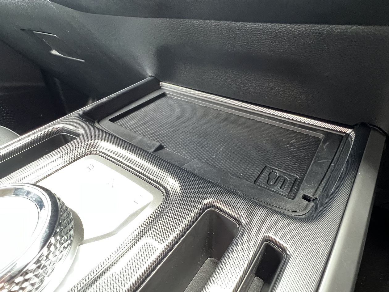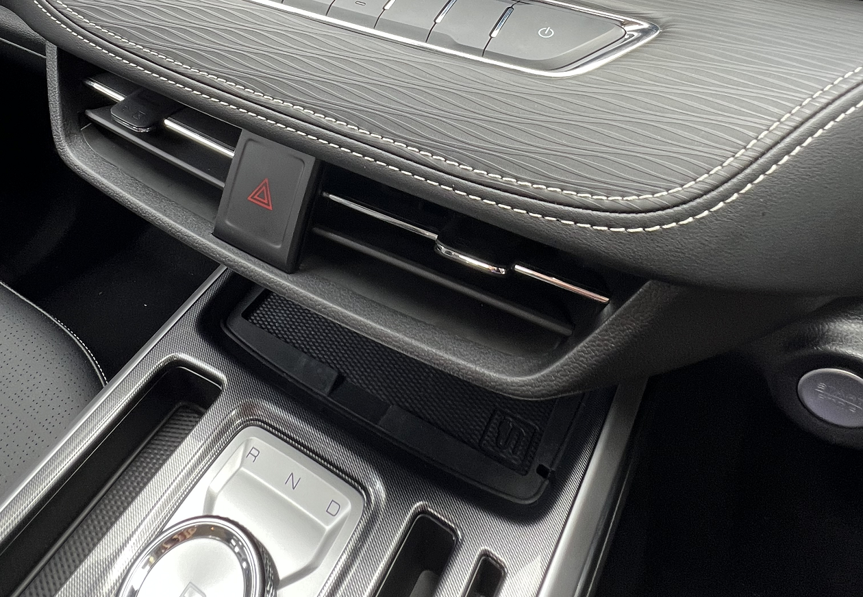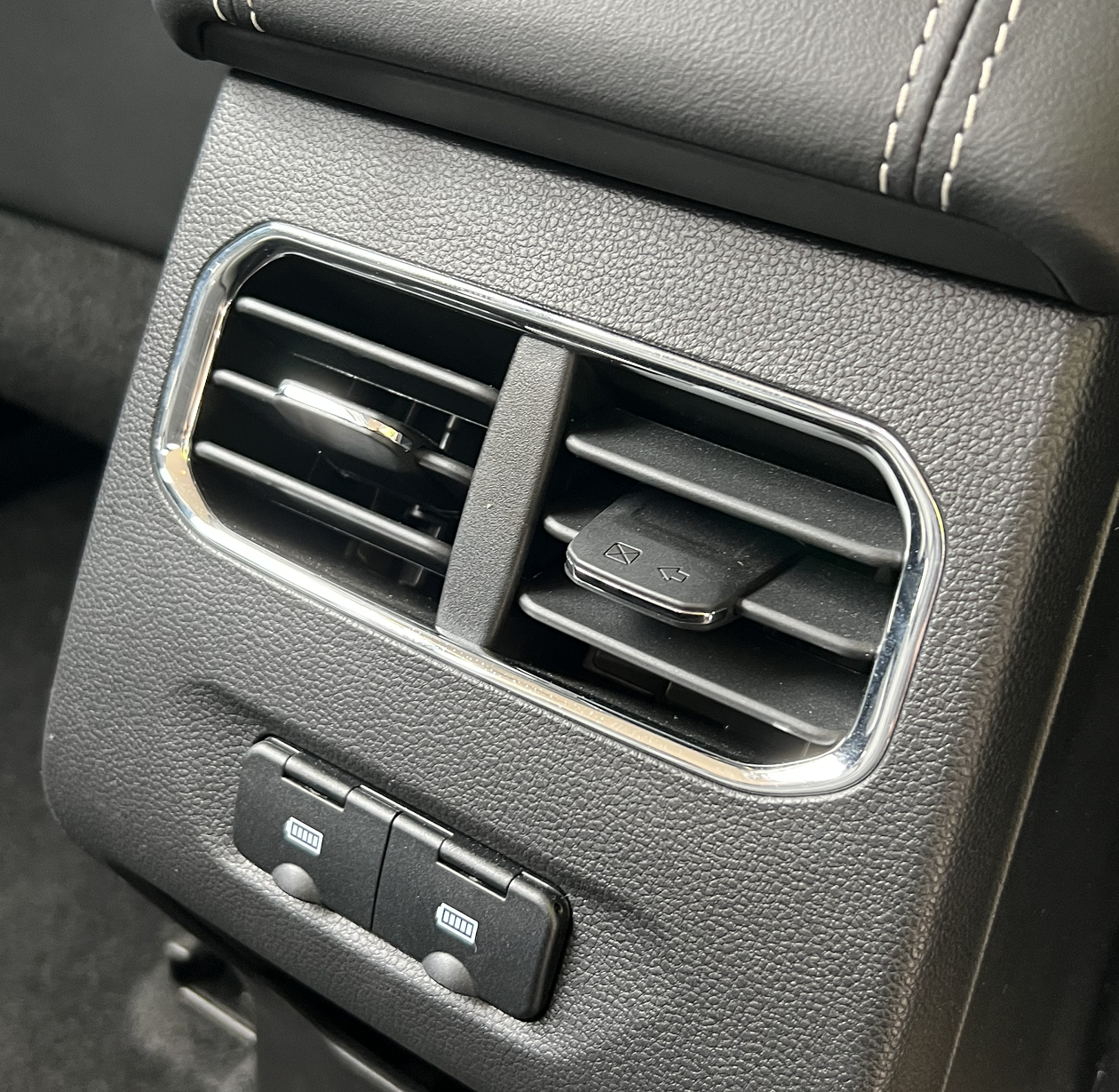 ช่องแอร์คู่กลางวางตำแหน่งไว้ต่ำไปหน่อย ถ้าอยากให้ลมแอร์เป่าหน้าต้องเปิดพัดลมให้แรงพอควร ถัดลงมาคอนโซลกลางจะเป็นแท่นชาร์จโทรศัพท์มือถือแบบไร้สาย ใกล้ๆ กันเป็น ปุ่มหมุนสีเงินสำหรับระบบขับเคลื่อน การทำงานเปลี่ยนตำแหน่งจาก N ไป D หรือ D ไป N ไป R ทำได้เร็วขึ้นกว่ารุ่นแรก แต่ก็ยังไม่รวดเร็วเท่าคันเกียร์แบบคันเลื่อนหรือปุ่มกดอยู่ดี ถัดมาอีกนิดเป็นที่วางแก้ว และเท้าแขนแบบ 2 ชั้น ด้านล่างซ่อนกล่องเก็บของขนาดใหญ่ มีปุ่มเบรคมือไฟฟ้า และปุ่ม Auto Hold Brake วางอยู่คู่กัน ด้านหลังมีช่องแอร์ให้ 2 ช่อง พร้อมจุดชาร์จมือถือแบบ USB ให้อีก 2 ช่อง สำหรับผู้โดยสารตอนหลัง