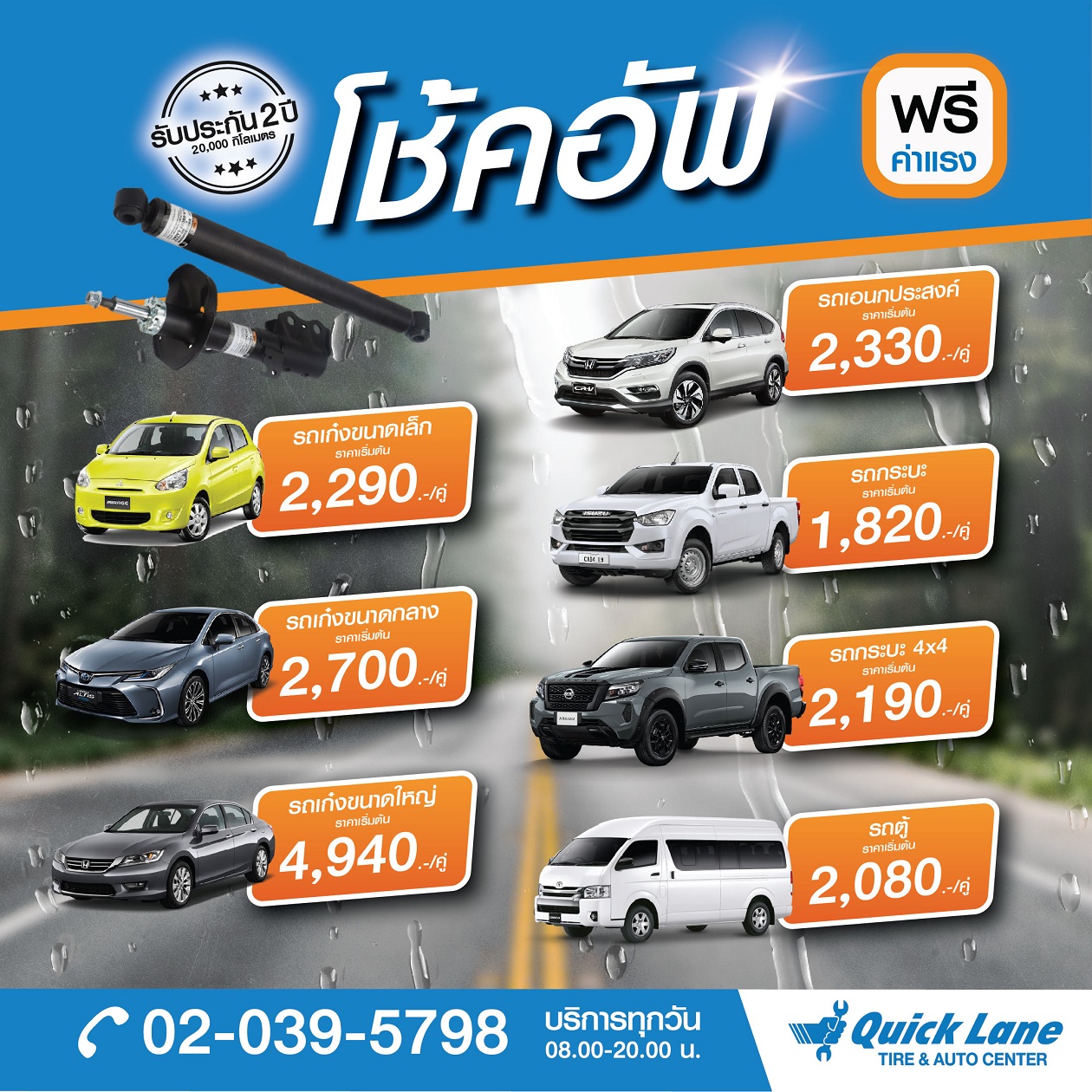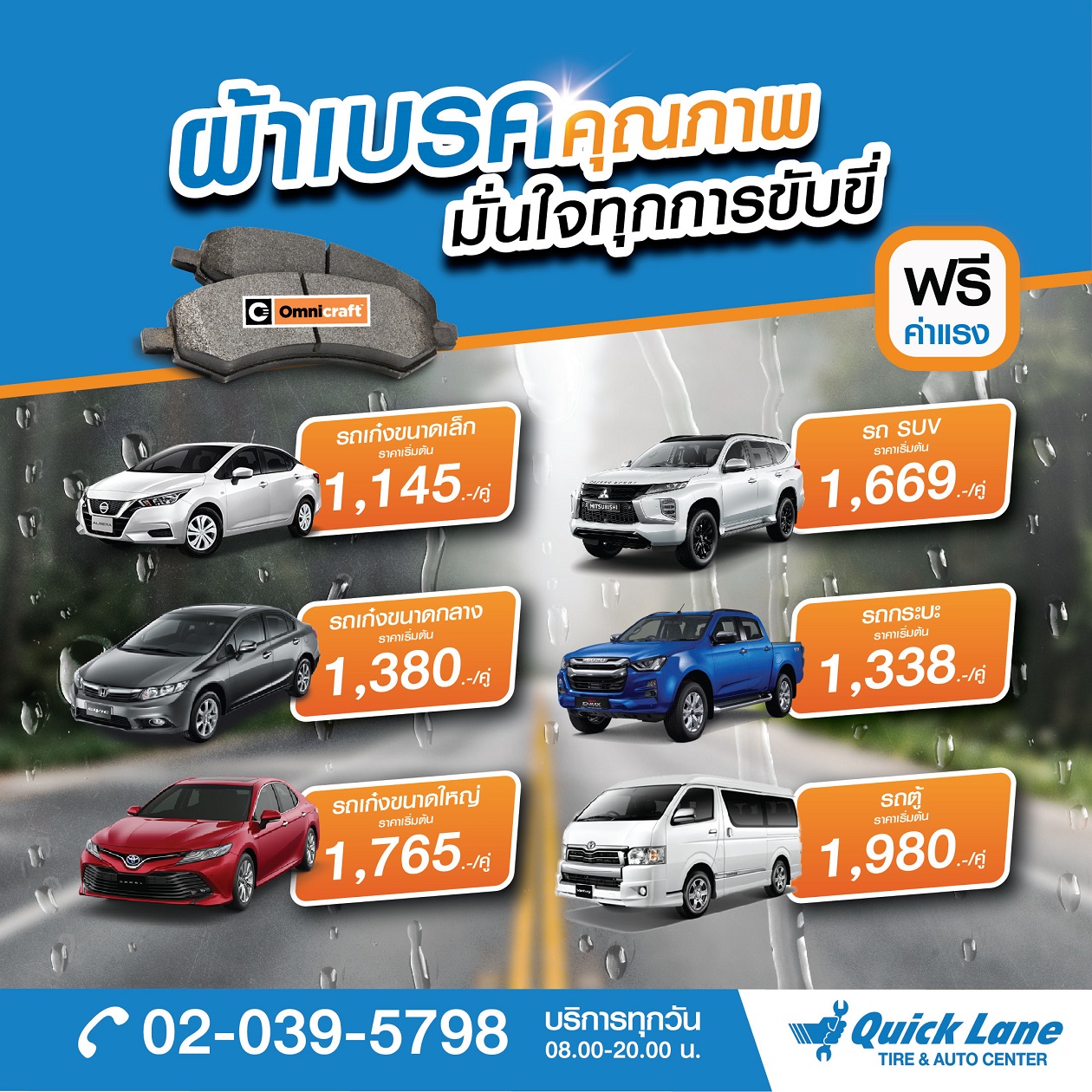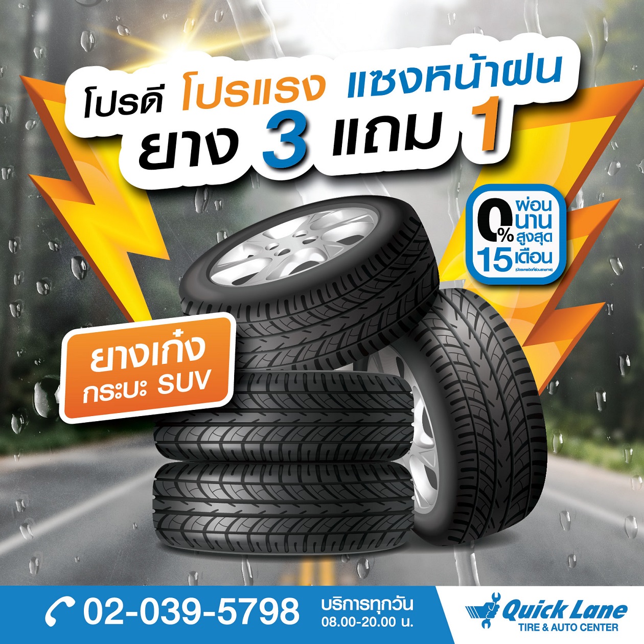 ควิกเลน พร้อมให้คำแนะนำและบริการในมาตรฐานระดับสากลที่ “สะดวกกว่า วางใจได้จริง” และนำเสนอ “โปรดี โปรแรงแซงหน้าฝน” พบกับ โปรโมชันยาง “Tyres of The Month” ยางรถยนต์คุณภาพสำหรับ รถเก๋ง รถกระบะ และรถเอสยูวี 3 เส้น แถมฟรี 1 เส้น ผ่อน 0% นานสูงสุด 15 เดือน ราคาเริ่มต้นเส้นละ 1,238 บาท อุ่นใจปลอดภัยตลอดทางตั้งแต่วันนี้ถึง 30 กันยายน 2566
