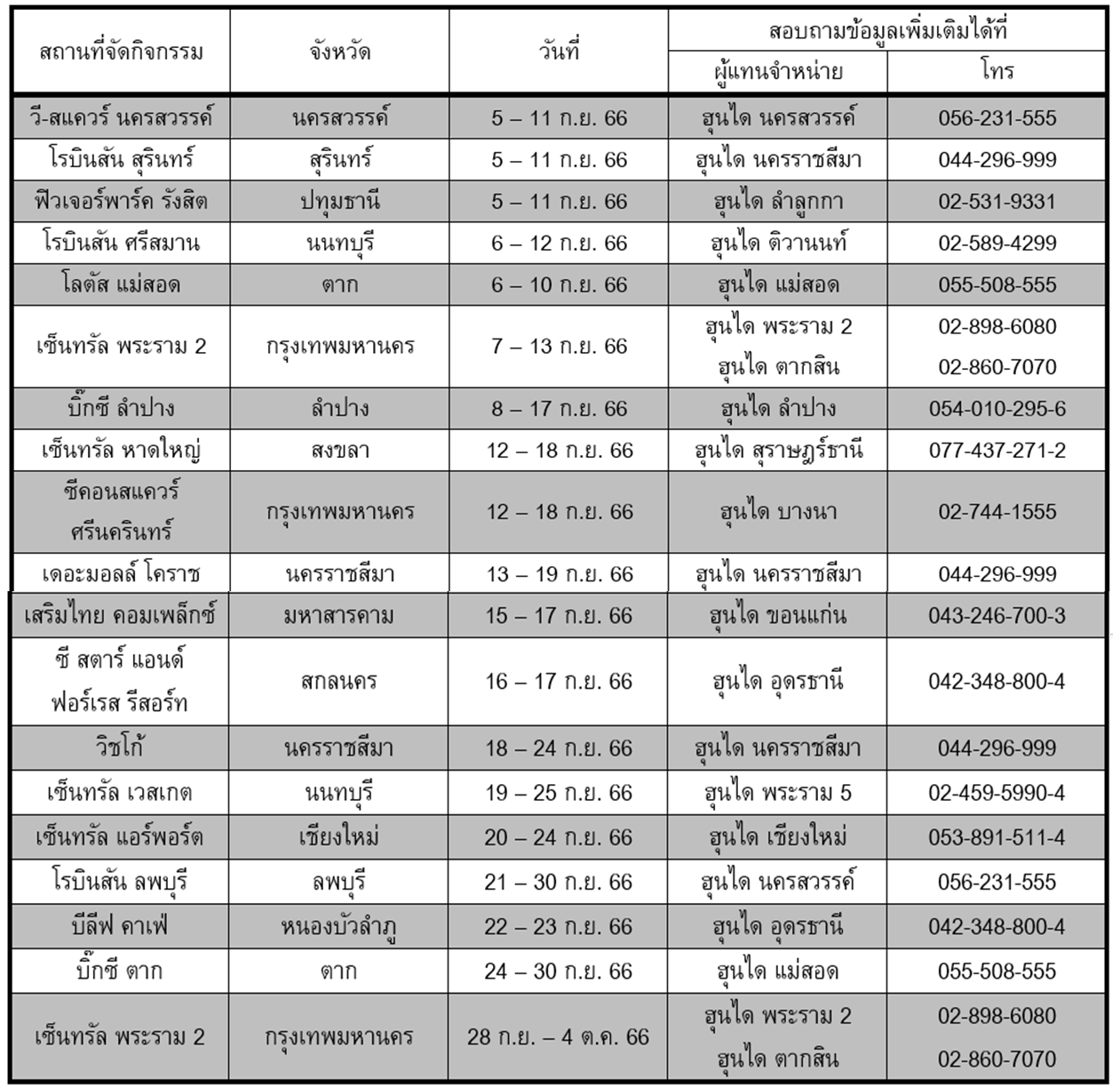ตารางกิจกรรมโรดโชว์ โดยผู้แทนจำหน่ายรถยนต์ฮุนไดทั่วประเทศ ประจำเดือนกันยายน