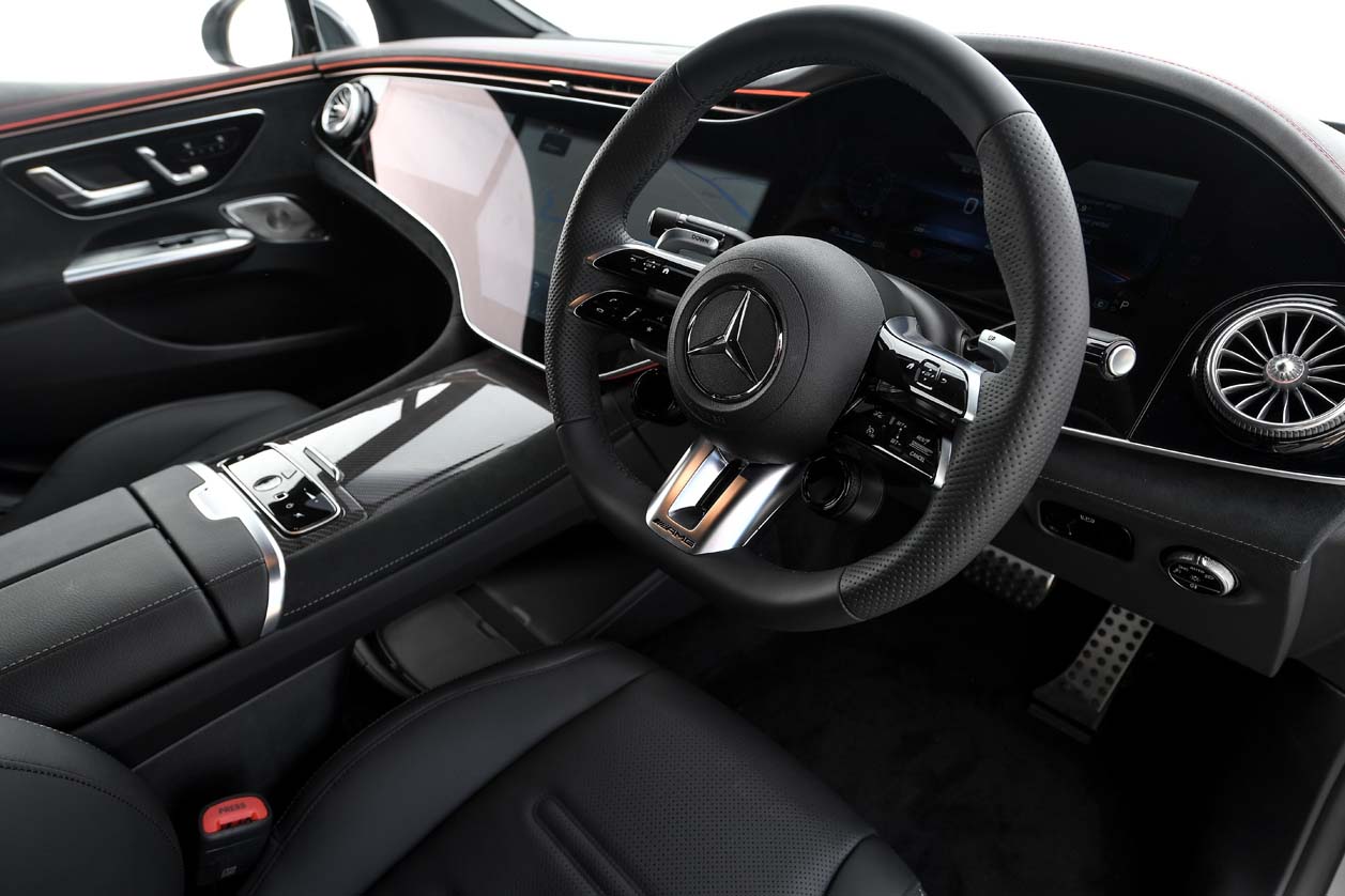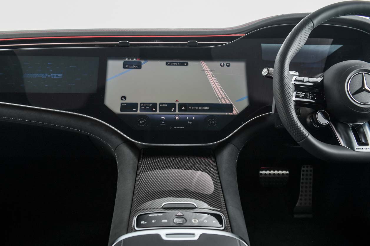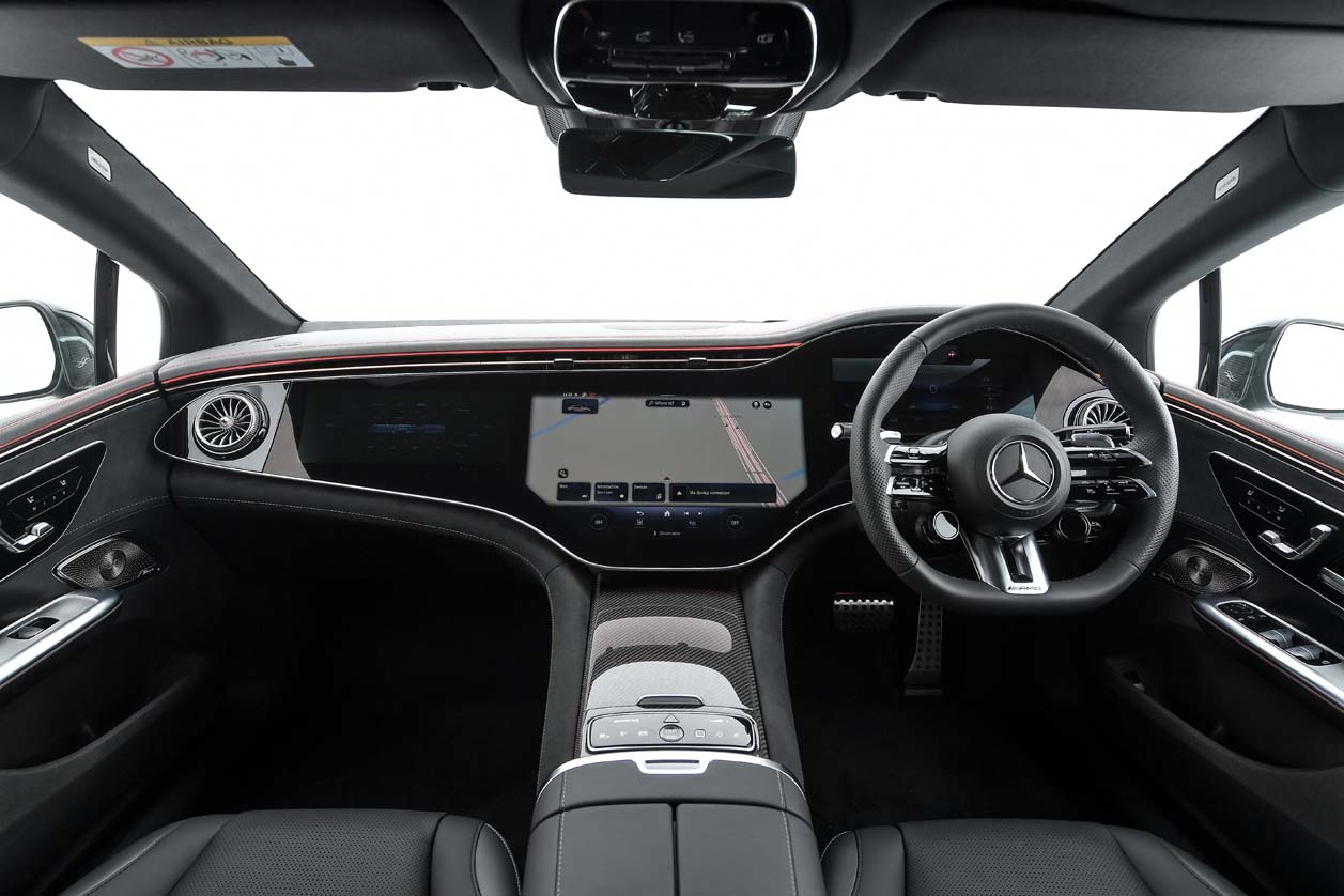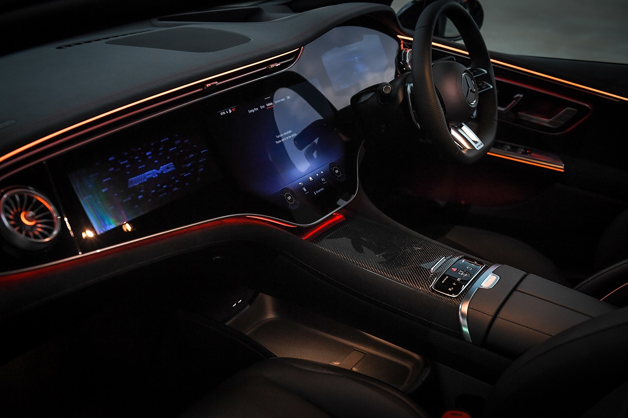 เมื่อเข้ามายังห้องโดยสารจะพบกับเบาะนั่งแบบ AMG Sport Seats ที่มีลวดลายเฉพาะรุ่น AMG พร้อมพวงมาลัยแบบ AMG Performance steering wheel หุ้มหนัง Nappa ช่วยให้การขับขี่เป็นไปได้อย่างคล่องแคล่วและสะดวกสบาย หน้าจอแสดงผลบริเวณแผงคอนโซลกลาง MBUX Hyperscreen ขนาด 56 นิ้ว แบ่งออกเป็น 3 ส่วน ประกอบไปด้วย หน้าจอ OLED ตรงกลางขนาด 17.7 นิ้ว ฝั่งซ้าย 12.3 นิ้วสำหรับผู้โดยสารตอนหน้า และหน้าจอ LED แสดงผลการขับขี่ขนาด 12.3 นิ้ว สำหรับผู้ขับขี่ โดยสามารถแสดงผลในโหมด AMG ได้โดยเฉพาะ พร้อมจอแสดงผลแบบ Head-up Display และยังมี AMG Track Pace ให้ผู้ขับขี่สามารถวัดสมรรถนะความเร็วของรถยนต์ พร้อมวิเคราะห์การขับขี่จากการประเมินส่วนบุคคลได้ อีกทั้งยังติดตั้งเทคโนโลยีต่าง ๆ มากมาย อาทิ ระบบนำทาง MBUX augmented reality ระบบควบคุมอุณหภูมิอัตโนมัติ THERMOTRONIC 4 โซน ระบบฟอกอากาศแบบ ENERGIZING AIR CONTROL และระบบชาร์จไร้สายสำหรับที่นั่งด้านหน้า ปิดท้ายด้วยระบบเครื่องเสียงรอบทิศทาง Burmester® 3D surround sound system และเทคโนโลยี Dolby Atmos® ที่พร้อมมอบความบันเทิงสูงสุดตลอดการขับขี่
