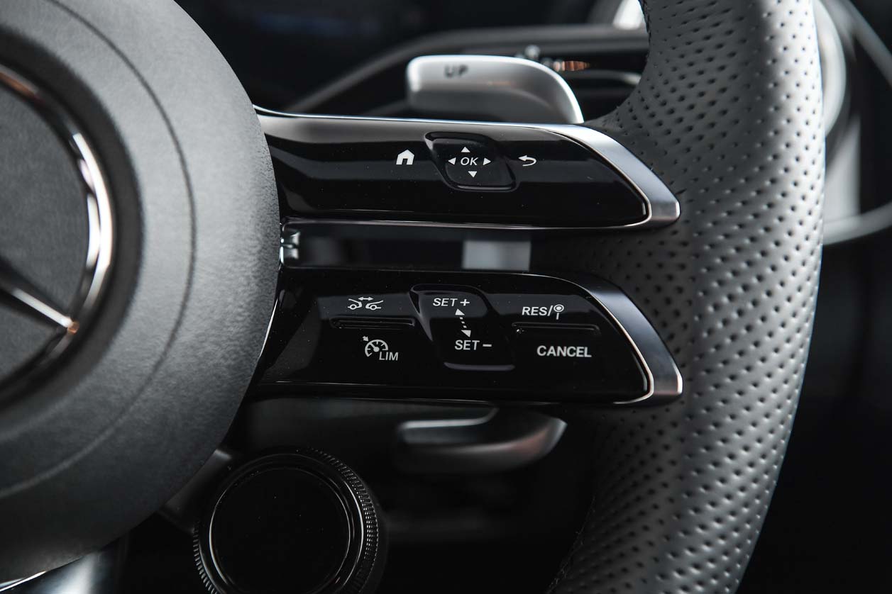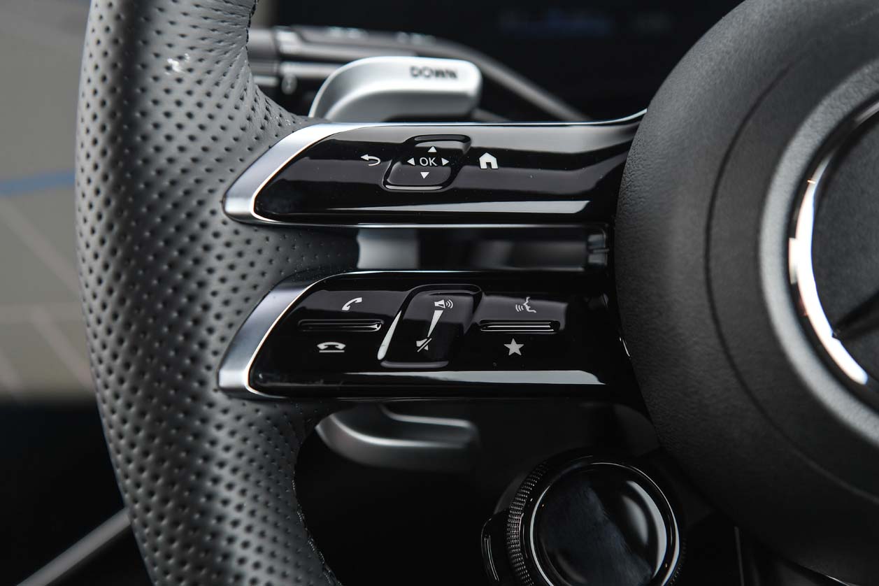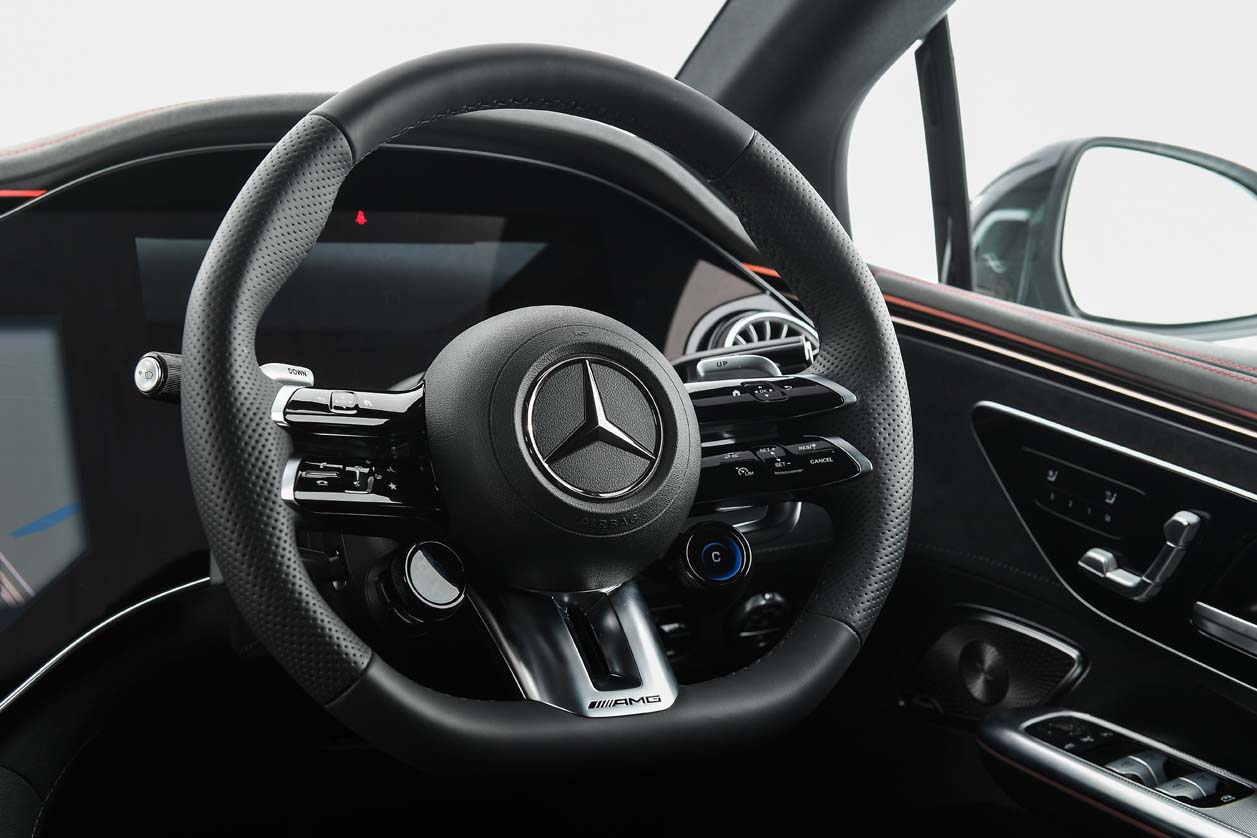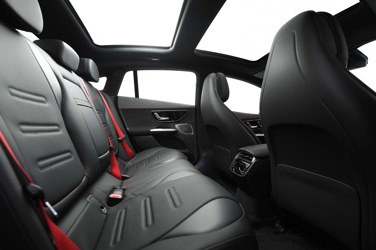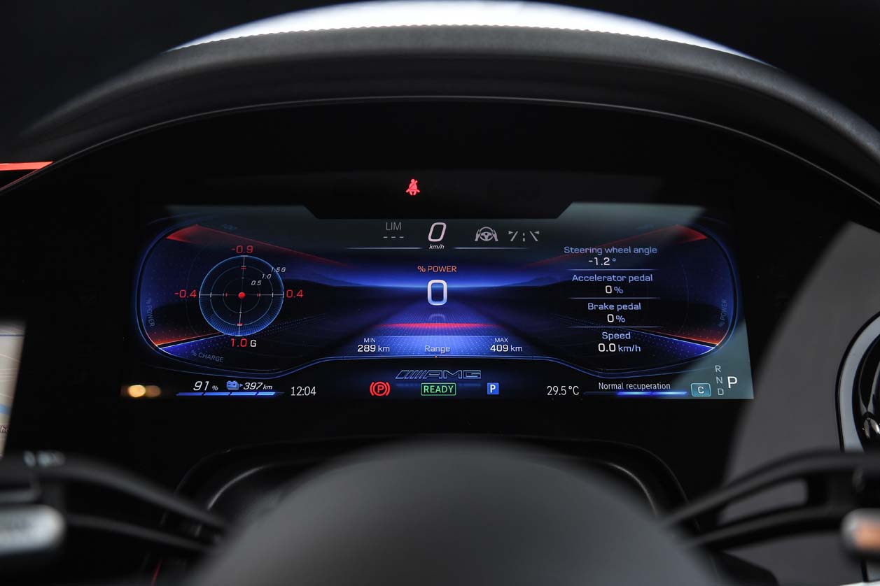 เมื่อเข้ามายังห้องโดยสารจะพบกับเบาะนั่งแบบ AMG Sport Seats ที่มีลวดลายเฉพาะรุ่น AMG พร้อมพวงมาลัยแบบ AMG Performance steering wheel หุ้มหนัง Nappa ช่วยให้การขับขี่เป็นไปได้อย่างคล่องแคล่วและสะดวกสบาย หน้าจอแสดงผลบริเวณแผงคอนโซลกลาง MBUX Hyperscreen ขนาด 56 นิ้ว แบ่งออกเป็น 3 ส่วน ประกอบไปด้วย หน้าจอ OLED ตรงกลางขนาด 17.7 นิ้ว ฝั่งซ้าย 12.3 นิ้วสำหรับผู้โดยสารตอนหน้า และหน้าจอ LED แสดงผลการขับขี่ขนาด 12.3 นิ้ว สำหรับผู้ขับขี่ โดยสามารถแสดงผลในโหมด AMG ได้โดยเฉพาะ พร้อมจอแสดงผลแบบ Head-up Display และยังมี AMG Track Pace ให้ผู้ขับขี่สามารถวัดสมรรถนะความเร็วของรถยนต์ พร้อมวิเคราะห์การขับขี่จากการประเมินส่วนบุคคลได้ อีกทั้งยังติดตั้งเทคโนโลยีต่าง ๆ มากมาย อาทิ ระบบนำทาง MBUX augmented reality ระบบควบคุมอุณหภูมิอัตโนมัติ THERMOTRONIC 4 โซน ระบบฟอกอากาศแบบ ENERGIZING AIR CONTROL และระบบชาร์จไร้สายสำหรับที่นั่งด้านหน้า ปิดท้ายด้วยระบบเครื่องเสียงรอบทิศทาง Burmester® 3D surround sound system และเทคโนโลยี Dolby Atmos® ที่พร้อมมอบความบันเทิงสูงสุดตลอดการขับขี่
