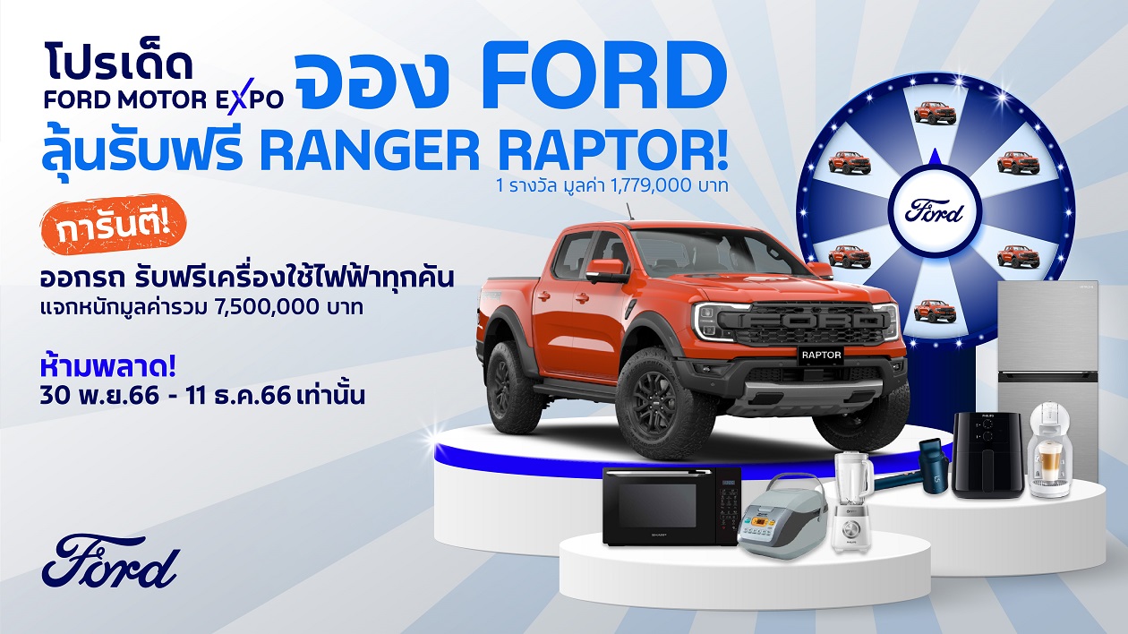 กรุงเทพฯ ประเทศไทย, 1 ธันวาคม 2566 - ฟอร์ด ประเทศไทย อัดโปรแรงท้ายปีต่อยอดความดุดันไปอีกขั้น เมื่อจองรถฟอร์ดรุ่นใดก็ได้ตั้งแต่วันที่ 30 พฤศจิกายน ถึง 11 ธันวาคม 2566 และออกรถภายในวันที่ 30 ธันวาคม 2566 มีสิทธิ์ลุ้นรับรถฟอร์ด เรนเจอร์ แร็พเตอร์ รุ่น 2.0 ลิตร จำนวน 1 รางวัล มูลค่า 1,779,000 บาท โดยเมื่อจอง 1 คัน จะได้รับ 1 สิทธิ์ลุ้น พร้อมรับทันทีเครื่องใช้ไฟฟ้า 1 ชิ้น โดยการจอง 1 คัน จะได้รับเครื่องใช้ไฟฟ้า 1 ชิ้น รวมมูลค่าของรางวัลในแคมเปญถึง 7,500,000 บาท ในงานมอเตอร์ เอ็กซ์โป 2023 และที่ผู้จำหน่ายอย่างเป็นทางการของฟอร์ดทั่วประเทศ
