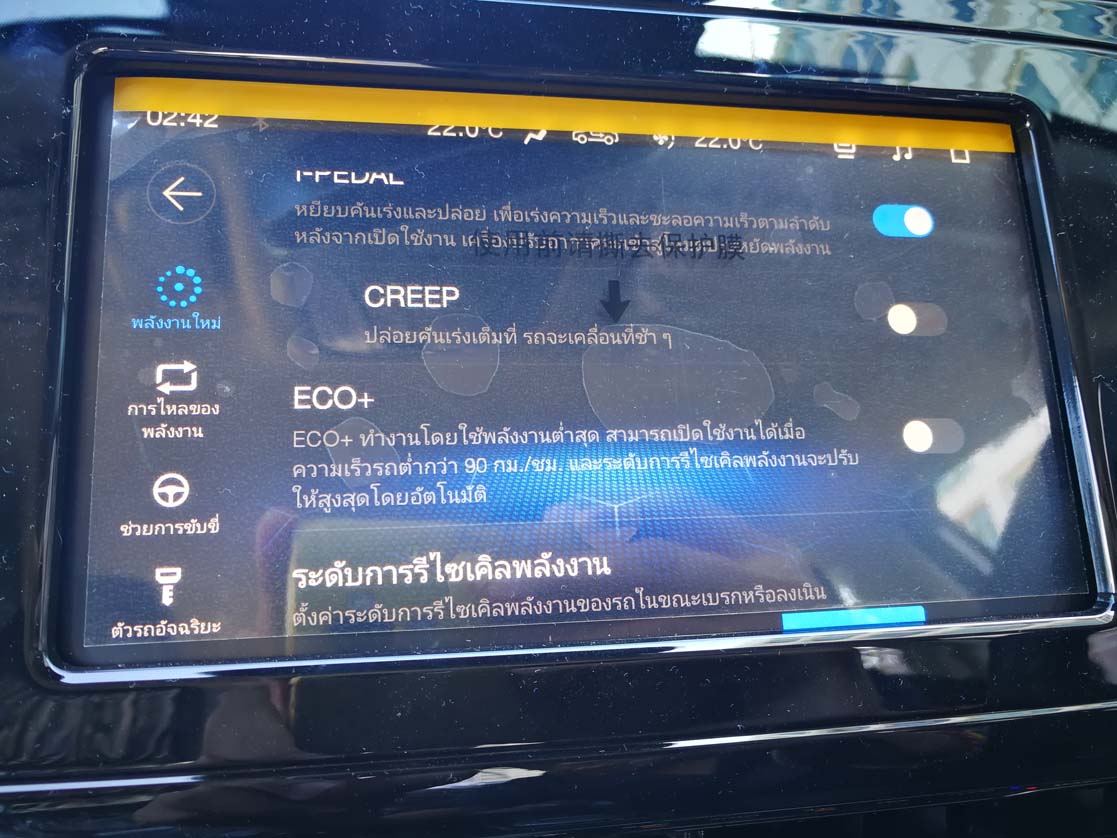 พวงมาลัยแบบ 2 ก้าน ปรับได้แค่ 2 ทิศทางเท่านั่น พวงมาลัยติดตั้งสวิทช์ Cruise Control ทางฝั่งขวา และปุ่มควบคุมเครื่องเสียง และหน้าจอ TFT ทางฝั่งซ้าย, ก้านสวิทช์ไฟเลี้ยว และไฟส่องสว่างอยู่ทางด้านซ้าย ไฟหน้าเปิด-ปิดแบบอัตโนมัติ, ก้านสวิทช์ปัดน้ำฝนอยู่ทางฝั่งขวา ปัดน้ำฝนตั้งเปิด-ปิดอัตโนมัติได้อีกเช่นกัน ใกล้ๆ กับพวงมาลัยจะมีปุ่ม Push Start ออยู่ทางฝั่งซ้าย ส่วนใต้ช่องแอร์ฝั่งคนขับติดตั้งปุ่มเปิดฝาท้าย, ปลอดล็อคที่ชาร์จ, ปิดแท็กชั่นคอนโทรล และ I-Pedal