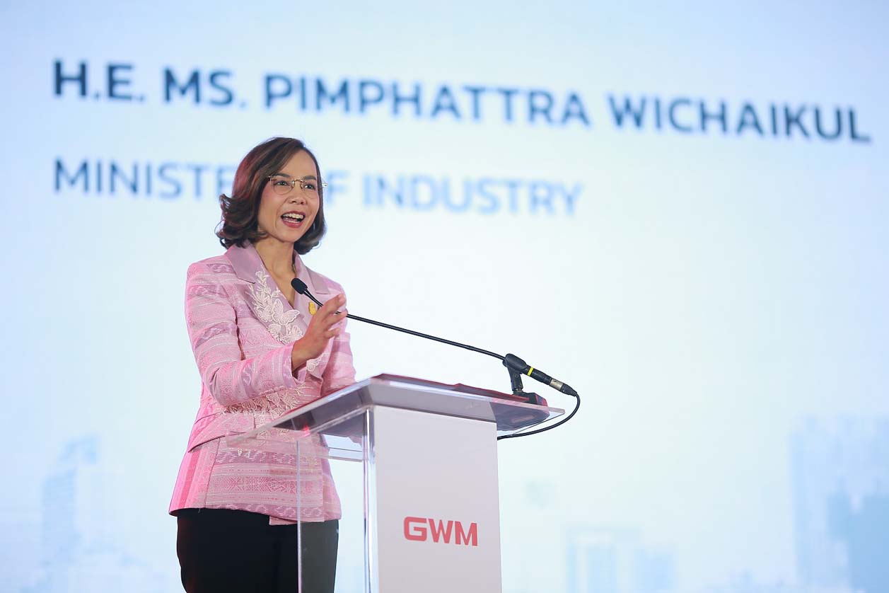 ฯพณฯ พิมภัทรา วิชัยกุล รัฐมนตรีว่าการกระทรวงอุตสาหกรรม กล่าวว่า “เป็นที่ทราบกันดีว่า อุตสาหกรรมยานยนต์ไฟฟ้าของไทยมีการขยายตัวอย่างต่อเนื่อง กระทรวงอุตสาหกรรมร่วมกับหน่วยงานที่เกี่ยวข้องทั้งภาครัฐและเอกชนได้ร่วมกันขับเคลื่อนนโยบายการส่งเสริมอุตสาหกรรมยานยนต์ไฟฟ้า เพื่อให้เกิดการลงทุนในอุตสาหกรรมยานยนต์ไฟฟ้าและชิ้นส่วนสำคัญในประเทศ ปัจจุบันมีผู้ได้รับอนุมัติให้การส่งเสริมการลงทุนผลิตรถยนต์ BEV มูลค่าการลงทุนรวม 39,579 ล้านบาท มีผู้ได้รับอนุมัติให้การส่งเสริมการลงทุนผลิตชิ้นส่วน BEV มูลค่าการลงทุนรวม 16,055 ล้านบาท และมีผู้ได้รับอนุมัติส่งเสริมการลงทุนสถานีอัดประจุไฟฟ้า มูลค่าการลงทุนรวม 5,106 ล้านบาท สะท้อนให้เห็นถึงความสำเร็จของนโยบายและมาตรการส่งเสริมรวมทั้งการพัฒนาโครงสร้างพื้นฐาน ทั้งนี้ บริษัท เกรท วอลล์ มอเตอร์ แมนูแฟคเจอริ่ง (ประเทศไทย) เป็นผู้ผลิตและจำหน่ายรถยนต์หลากหลายรุ่นและได้รับความนิยมอยู่ในอันดับต้น ๆ ของประเทศ โดยเฉพาะรุ่น ORA Good Cat ที่ยังคงได้รับความนิยมอย่างต่อเนื่อง การเปิดสายการผลิตรถยนต์ไฟฟ้า New GWM ORA Good Cat คันแรกในประเทศไทยในวันนี้ จึงนับเป็นจุดเริ่มต้นของการก้าวสู่การเป็นฐานการผลิตยานยนต์ไฟฟ้าในภูมิภาคอาเซียน ดิฉันหวังเป็นอย่างยิ่งว่าบริษัทฯ จะขยายการลงทุนในการผลิตยานยนต์และชิ้นส่วน รวมทั้งพัฒนารถยนต์ไฟฟ้ารุ่นใหม่ ๆ และสนับสนุนการใช้ห่วงโซ่การผลิตในประเทศ เพื่อรักษาและต่อยอดการเป็นหนึ่งในฐานการผลิตยานยนต์พวงมาลัยขวา สำหรับจำหน่ายในประเทศและส่งออกในภูมิภาคอย่างยั่งยืน”