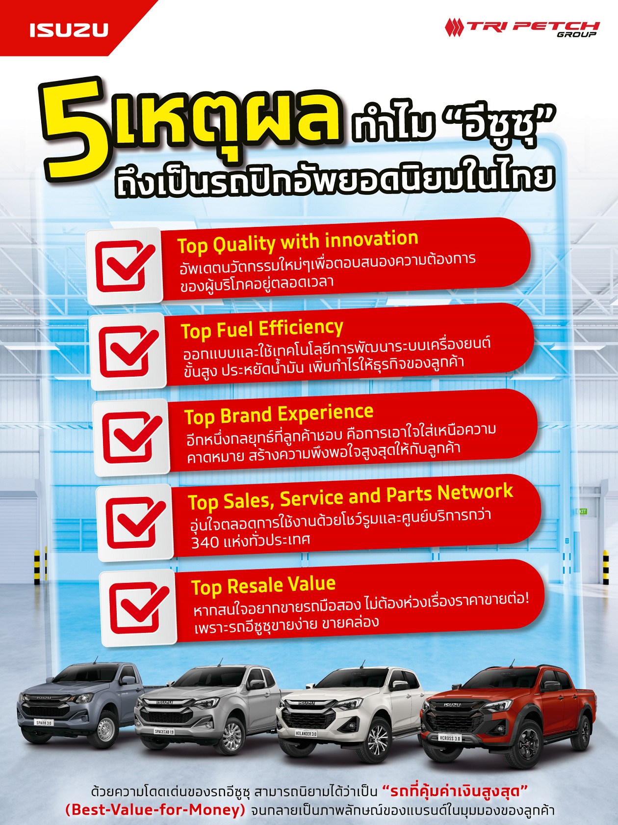 ราคาขายต่อดีสุด (Top Resale Value) อีซูซุยังคงเป็นแบรนด์ที่ยึดมั่นในนโยบาย “การไม่ร่วมสงครามราคา” ซึ่งเป็นปัจจัยสำคัญในการช่วยรักษาราคาขายต่อของรถอีซูซุในตลาดรถมือสองได้เป็นอย่างดี
