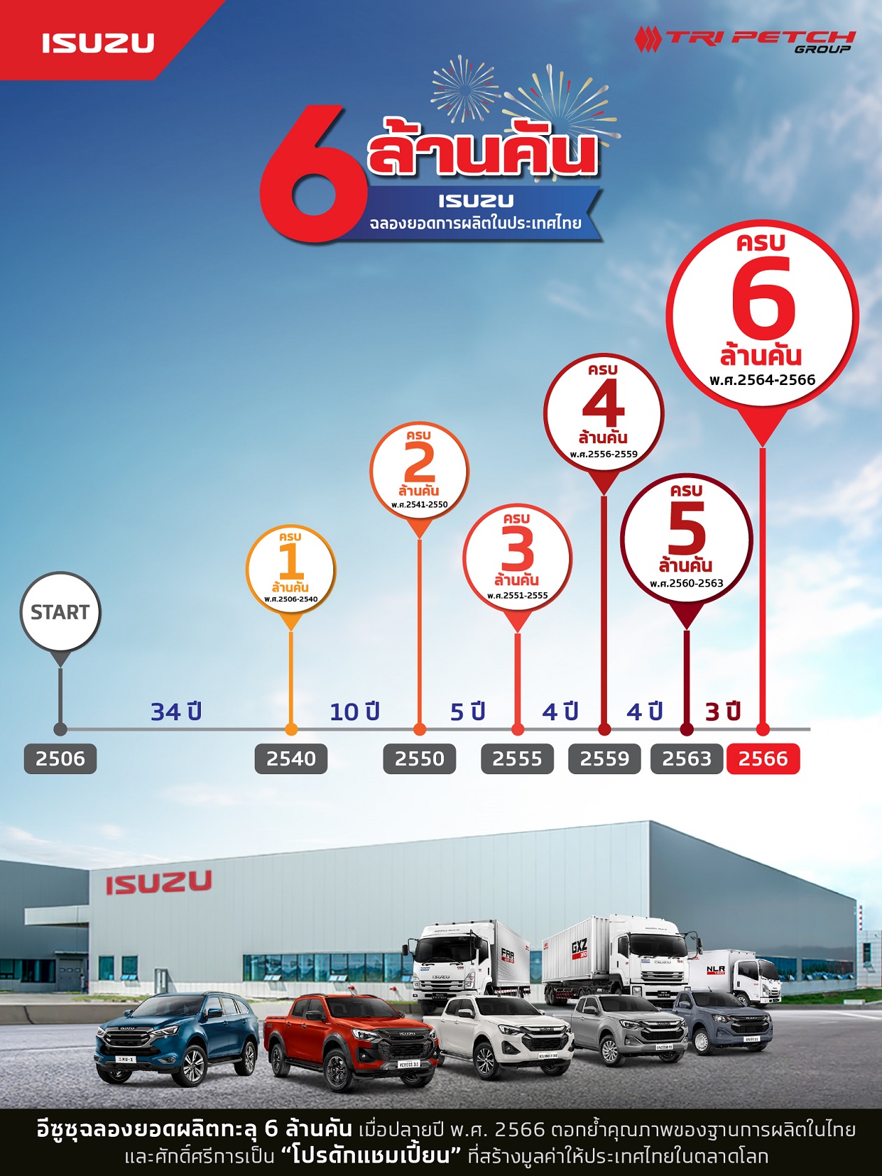 กลุ่มตรีเพชร โดย มร.ทาคาชิ ฮาตะ กรรมการผู้จัดการ บริษัท ตรีเพชรอีซูซุเซลส์ จำกัด เผยว่า “อีซูซุได้เริ่มเปิดสายการผลิตรถยนต์ครั้งแรกในประเทศไทยในปี พ.ศ.2506 ซึ่งการผลิตครบ 1 ล้านคันแรกใช้เวลา 34 ปี แต่ด้วยการเติบโตแบบก้าวกระโดดอย่างต่อเนื่อง ทำให้การผลิตครบทุก ๆ 1 ล้านคันต่อมาใช้เวลาลดลง แม้ในยามวิกฤต เช่น ช่วงวิกฤตเศรษฐกิจต้มยำกุ้งในปี 2540 หรือแม้แต่ในช่วงที่เกิดสถานการณ์โควิด-19 อีซูซุก็ยังสามารถเป็นแบรนด์ที่ฝ่าวิกฤตด้วยยอดผลิตครบ 6 ล้านคันเมื่อปลายปีที่ผ่านมา โดยใช้เวลาเพียง 3 ปีหลังจากวาระครบรอบ 5 ล้านคันเท่านั้น