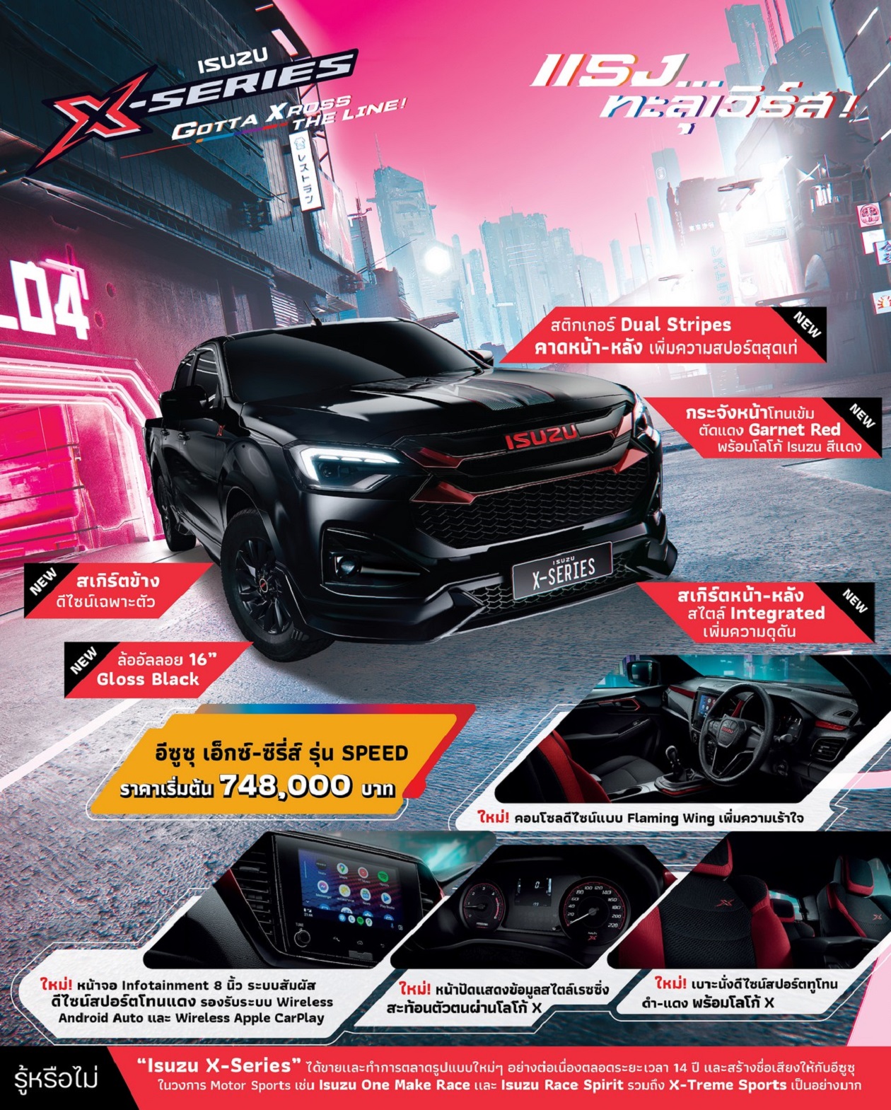 “อีซูซุ เอ็กซ์-ซีรี่ส์ รุ่น SPEED” (ISUZU X-SERIES SPEED) จัดไป...ใส่เต็มสปีด! ปิกอัพสปอร์ตแนวสตรีทเรซ กับไอเทมรอบคัน ให้คุณมันส์เร้าใจทะลุเวิร์สไปกับทุกสปีดที่ใจต้องการ โดดเด่นด้วยกระจังหน้าโทนเข้มตัดแดง Garnet Red สติกเกอร์ Dual Stripes คาดหน้า-หลัง พร้อมสเกิร์ตหน้า-หลังสไตล์ Integrated สเกิร์ตข้างดีไซน์เฉพาะตัว ล้ออัลลอย 16” Gloss Black ห้องโดยสารโทนดำ-แดง ให้อารมณ์สปอร์ตเร้าใจ ราคาจำหน่ายตั้งแต่ 748,000 – 851,000 บาท