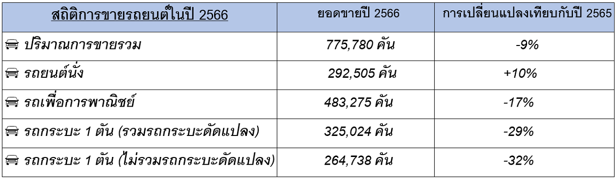 ทั้งนี้ จากปัจจัยต่าง ๆ ดังกล่าว ได้สะท้อนมายังตลาดรถยนต์ในประเทศ โดยมีตัวเลขยอดขายรวมในปี 2566 อยู่ที่ 775,780 คัน หรือลดลง 9% เมื่อเทียบกับปี 2565
