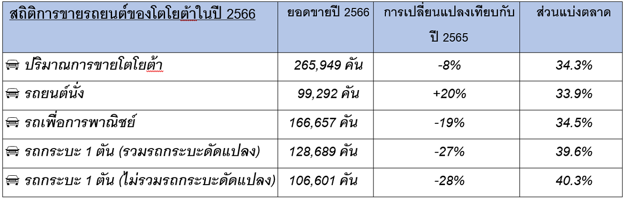 สำหรับยอดขายของโตโยต้าในปี 2566 มียอดขายโดยรวมอยู่ที่ 265,949 คัน หรือลดลง 8% เมื่อเทียบกับปีที่ผ่านมา หากแต่ยังคงมีส่วนแบ่งทางการตลาดเป็นอันดับ 1 หรือเท่ากับ 34.3% ของยอดขายรถยนต์ทั้งหมด ส่วนหนึ่งเป็นผลมาจากการที่ส่วนแบ่งทางการตลาดรถยนต์นั่งของโตโยต้ามีการเติบโตสูงขึ้นจากปีที่แล้วอย่างเห็นได้ชัด โดยเฉพาะอย่างยิ่งในกลุ่มรถอีโคคาร์ที่ยังคงสามารถครองส่วนแบ่งทางการตลาดเป็นอันดับ 1 ได้อย่างต่อเนื่อง จากความสำเร็จด้านยอดขายของรถยนต์ Yaris ATIV รวมถึงการมีรถยนต์รุ่นใหม่อย่าง Yaris Cross ที่เพิ่งเปิดตัวไปเมื่อช่วงปลายปีที่ผ่านมาและได้รับการตอบรับเป็นอย่างดีจากลูกค้า นอกจากนี้ การดำเนินกิจกรรมทางการตลาดในรูปแบบต่างๆ ตลอดจนการมีผลิตภัณฑ์ยานยนต์ที่หลากหลายของโตโยต้า ก็มีส่วนทำให้สามารถเข้าถึงและใกล้ชิดกับลูกค้าในกลุ่มเป้าหมายต่างๆได้ดียิ่งขึ้นอีกด้วย