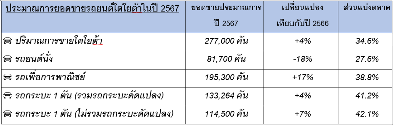 สำหรับโตโยต้า ตั้งเป้ายอดขายอยู่ที่ 277,000 คัน หรือเพิ่มขึ้น 4% โดยมีส่วนแบ่งทางการตลาดอยู่ที่ 34.6%