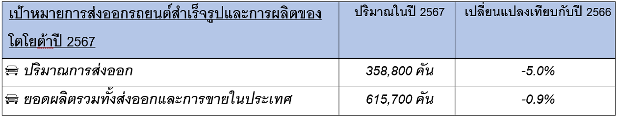 สำหรับเป้าหมายการส่งออกรถยนต์สำเร็จรูปของโตโยต้าในปี 2567 คาดการณ์ว่ายังต้องเผชิญกับผลกระทบจากสถานการณ์เศรษฐกิจโลกที่ยังคงมีแนวโน้มเติบโตต่ำ ตลอดจนภาวะฟื้นตัวทางเศรษฐกิจและกำลังซื้อของประเทศคู่ค้าที่ยังคงชะลอตัว ส่งผลให้โตโยต้าตั้งเป้าปริมาณการส่งออกรถยนต์อยู่ที่ 358,800 คัน หรือลดลง 5% เมื่อเทียบกับปีที่ผ่านมา และได้ตั้งเป้าการผลิตรถยนต์ทั้งหมดของปี 2567 อยู่ที่ราว 615,700 คัน หรือลดลง 0.9% จากปีที่ผ่านมา