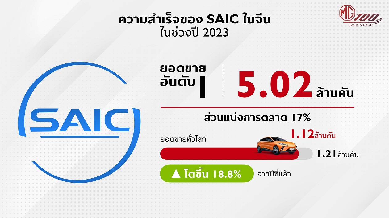 มร. ซู๋ว์ หยิ่น กรรมการผู้จัดการ บริษัท เอ็มจี เซลส์ (ประเทศไทย) จำกัด และรองกรรมการผู้จัดการ บริษัท เอสเอไอซี มอเตอร์ – ซีพี จำกัด กล่าวว่า “สำหรับปี 2566 ที่ผ่านมา ถือเป็นปีที่มีความท้าทายในเรื่องอุตสาหกรรมยานยนต์โลกชะลอตัวจากปัจจัยต่างๆ แต่ SAIC Motor Corporation มียอดขายรถยนต์รวมกว่า 5.02 ล้านคัน โดยยังคงรักษาตำแหน่งอันดับหนึ่งของกลุ่มบริษัทรถยนต์ในประเทศจีนต่อเนื่องเป็นปีที่ 18 ด้วยศักยภาพในการส่งออกรถยนต์ไปทั่วโลกกว่า 1.208 ล้านคัน มีอัตราการเติบโต 18.8% เมื่อเทียบกับปี 2565 และมีปริมาณยอดขายรถยนต์ New Energy มากกว่า 1.123 ล้านคัน เติบโตถึง 4.6% โดย MG ZS เป็นรถที่ส่งออกจากประเทศจีนมากที่สุดเป็นอันดับหนึ่งในหมวดรถยนต์นั่ง มียอดส่งออกกว่า 201,874 คัน ตามมาด้วยรถยนต์ไฟฟ้า MG4 ELECTRIC ที่สร้างความสำเร็จในตลาดทั่วโลกและเป็นโกลบอลโมเดลขวัญใจของคนไทย มียอดส่งออกกว่า 138,736 คัน และ MG5 มียอดส่งออกกว่า 109,431 คัน ส่งผลให้ SAIC Motor Corporation ขึ้นแท่นเป็นแบรนด์ที่ส่งออกรถยนต์เป็นอันดับต้นๆ ของประเทศจีน