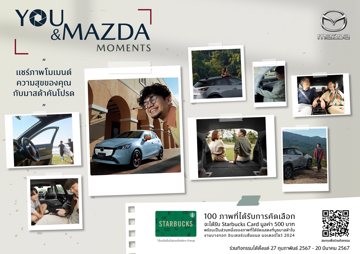 เพื่อพัฒนาความสัมพันธ์ให้แน่นแฟ้นยิ่งขึ้นระหว่างลูกค้าและแบรนด์มาสด้า ตอกย้ำถึงความสำคัญของการมีลูกค้าเข้ามาเป็นส่วนหนึ่งในทุกประสบการณ์การใช้ชีวิต มาสด้าขอเชิญลูกค้ามาร่วมถ่ายทอดเรื่องราวความประทับใจเหล่านี้ไปด้วยกัน ผ่านกิจกรรม “You and Mazda Moments” ด้วยการแชร์ภาพความประทับใจของคุณคู่กับรถมาสด้าคันโปรดผ่านช่องทางที่กำหนด ซึ่งมาสด้าจะรวบรวมภาพความสุขของลูกค้ามาสด้าเหล่านี้มาจัดเป็น Photo Gallery โซนสุดพิเศษและจัดแสดงในงานมอเตอร์โชว์ 2024 พร้อมทั้งประชาสัมพันธ์ในสื่อต่างๆ ของมาสด้า โดยแบ่งเป็นโซนพิเศษให้ประชาชนที่มาเข้าชมงานฯ ได้เห็นถึงความสุขในการขับขี่ที่เกิดขึ้นกับลูกค้ามาสด้าและครอบครัว”