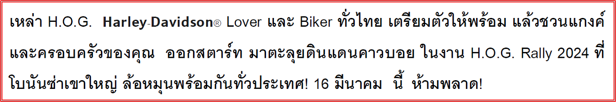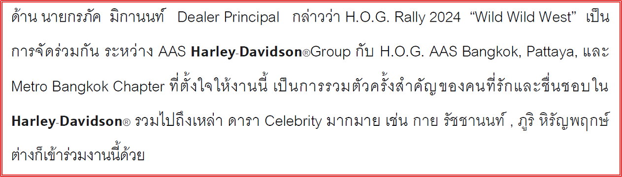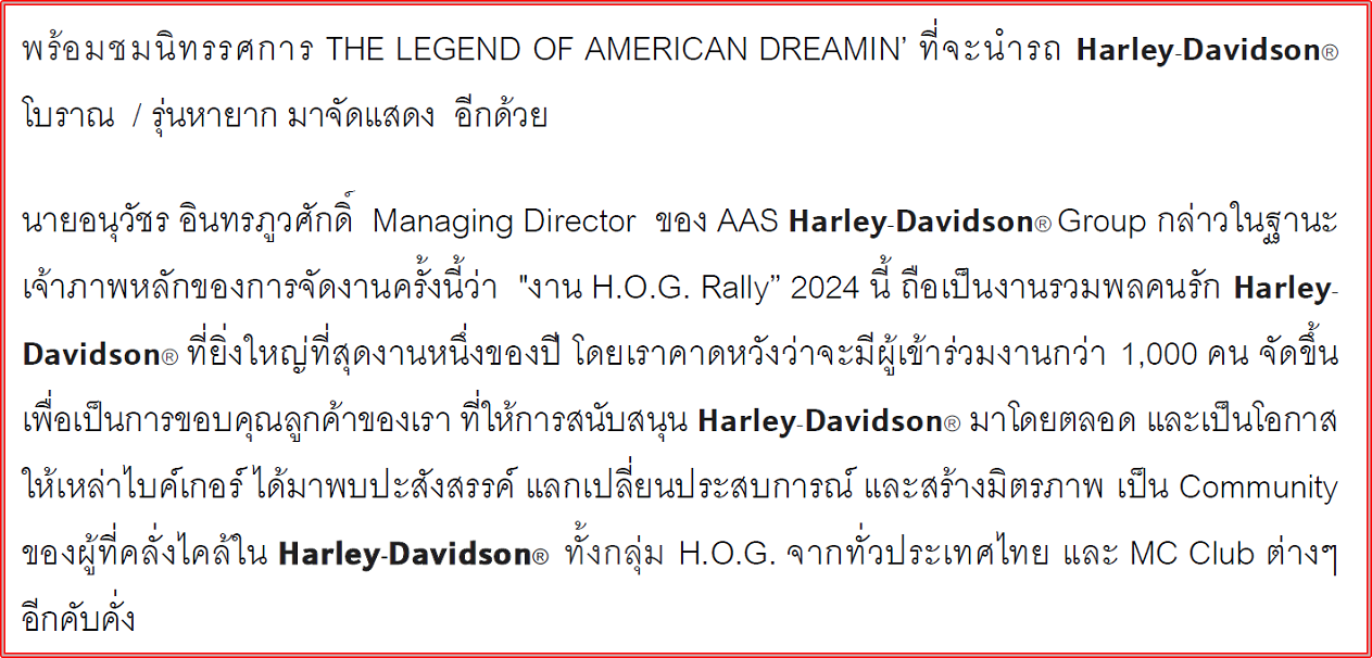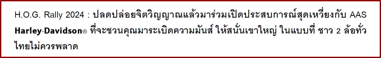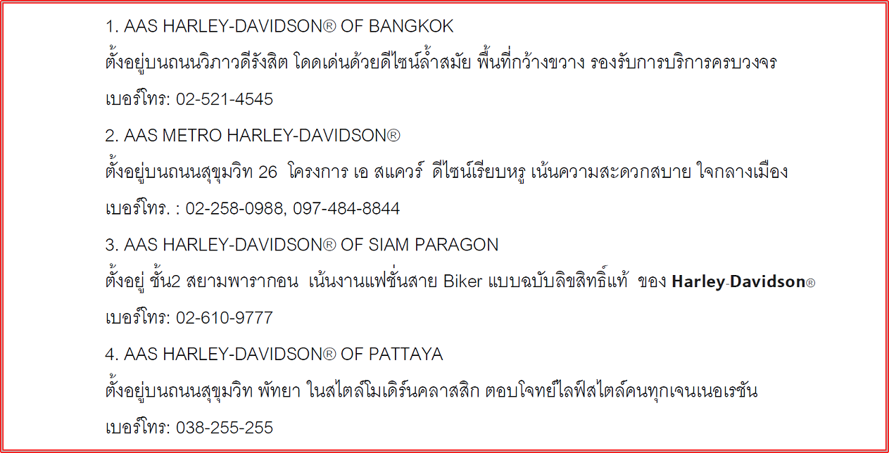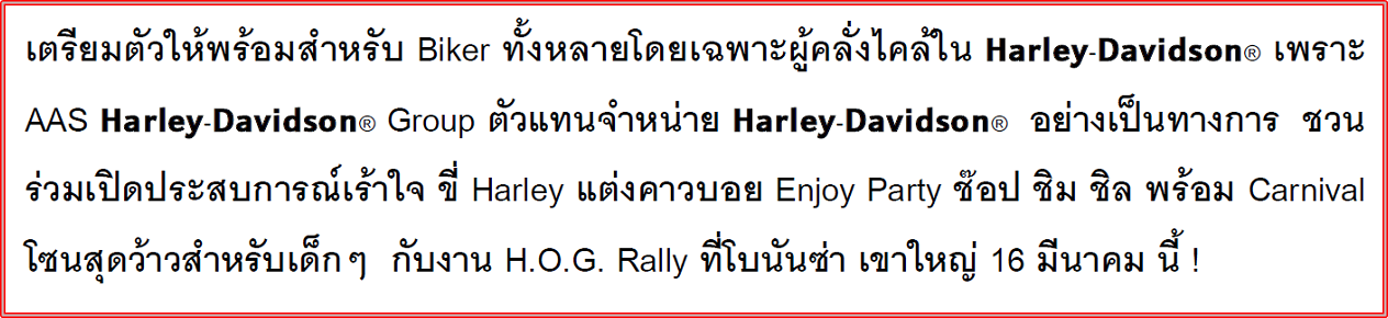 หรือสอบถามการจัดงาน H.O.G. Rally โดยตรง รวมทั้งติดต่อ จองคิวเพื่อทดลองขับรถ Test Ride และเข้ารับบริการโดยช่างผู้ชำนาญการ ได้ที่ โชว์รูม AASทั้ง 4 สาขาของเรา ได้แก่