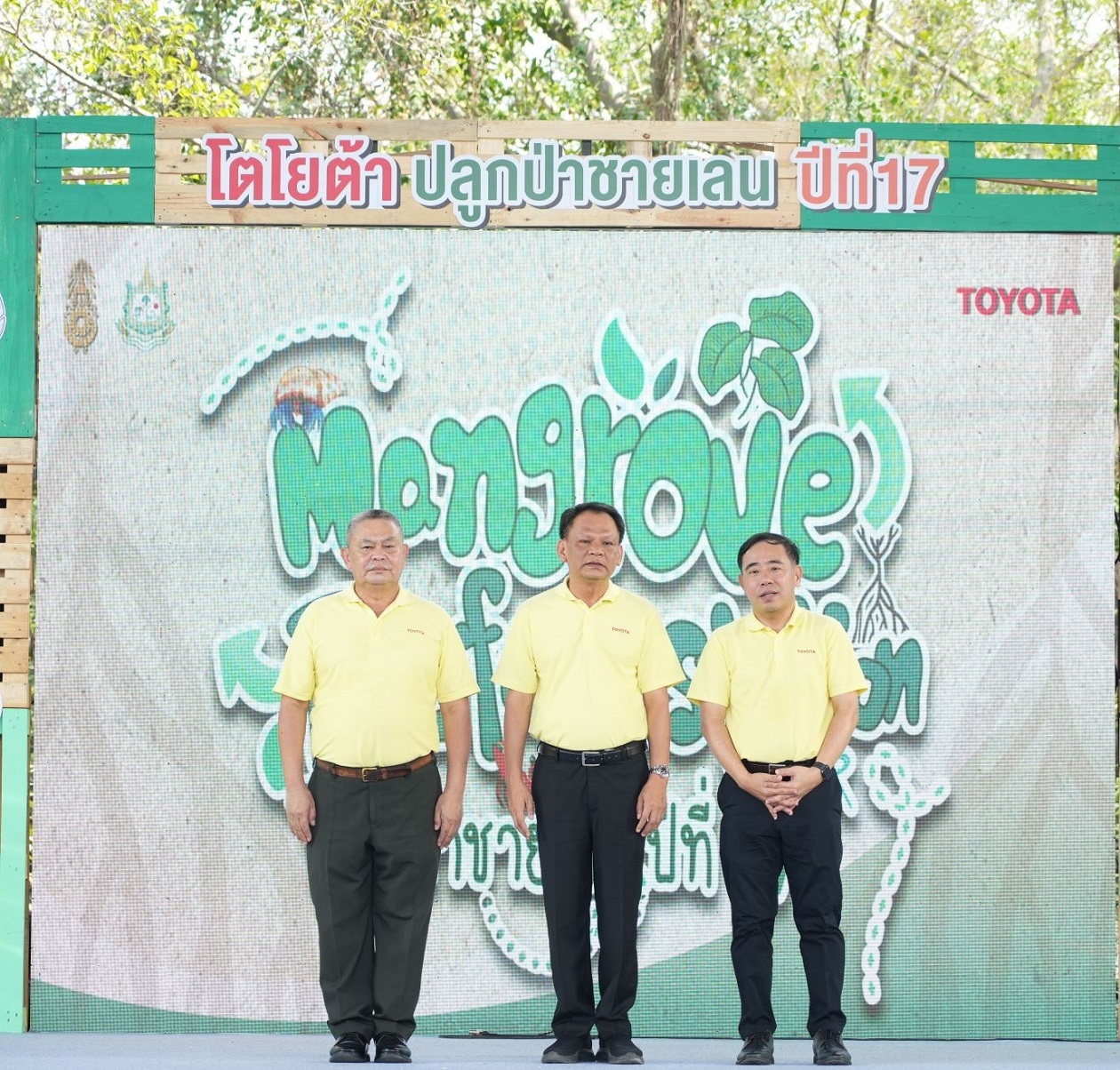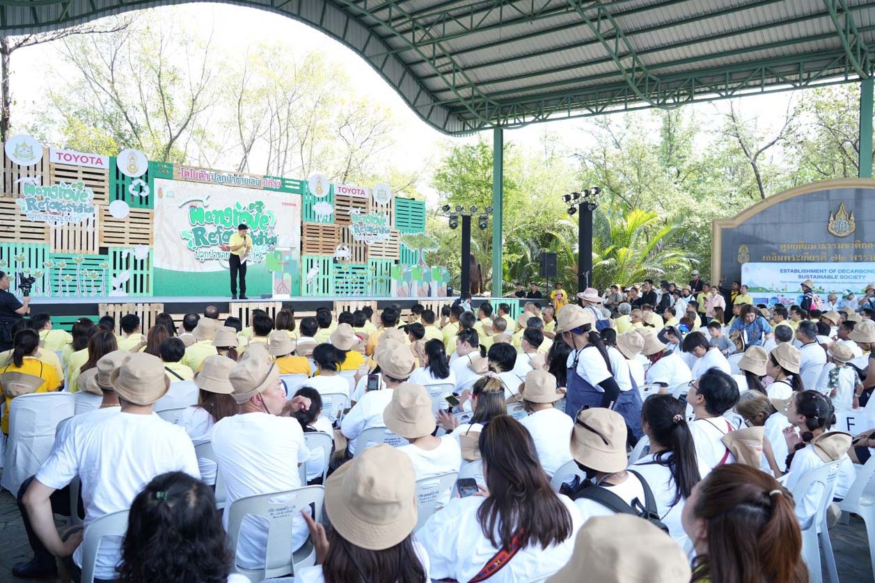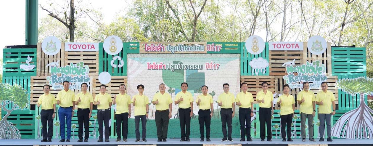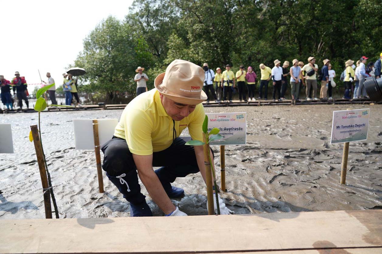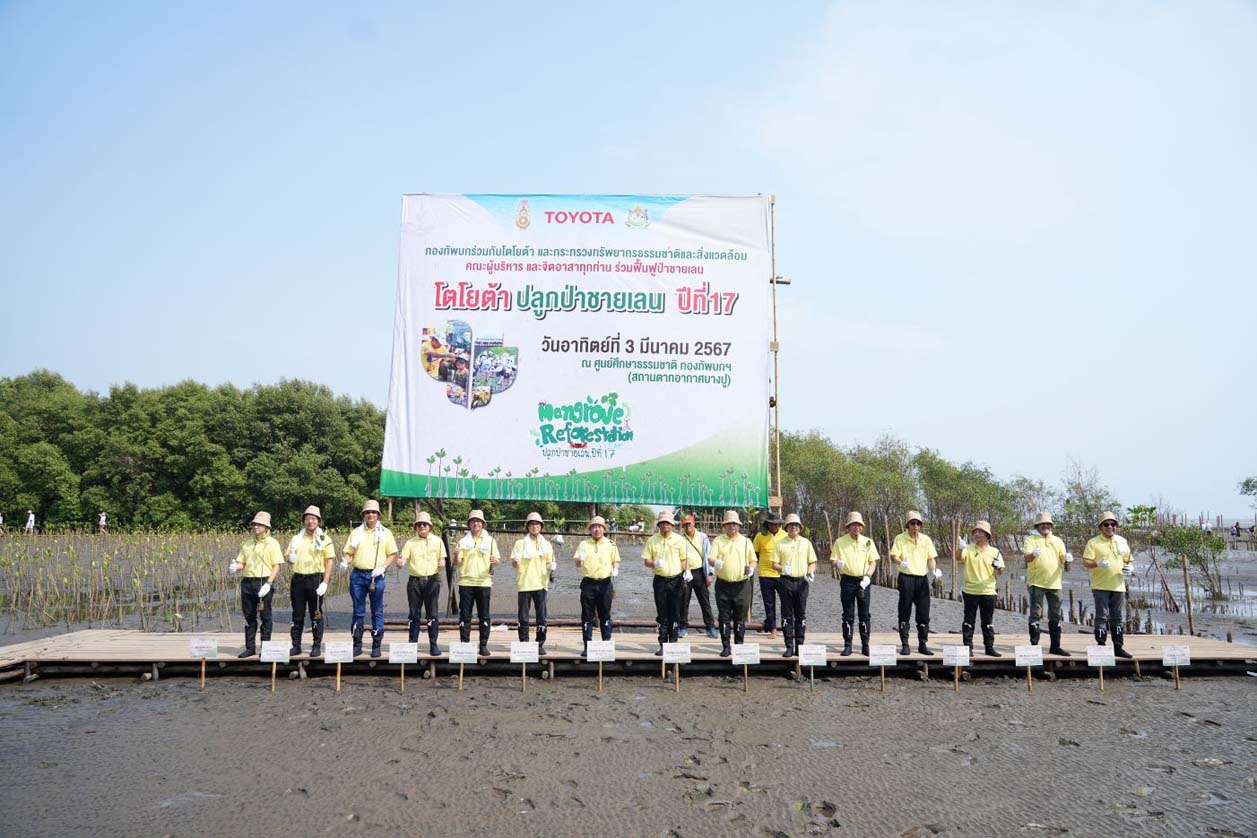 นายวัฒนา เจริญจิตร นายอำเภอเมืองสมุทรปราการ พลตรี ธวัช ชาลีรัตน์ รองเจ้ากรมพลาธิการทหารบก และนายสมคิด ประดิษฐกำจรชัย รองกรรมการผู้จัดการใหญ่ บริษัท โตโยต้า มอเตอร์ ประเทศไทย จำกัด พร้อมด้วยคณะผู้บริหารระดับสูงของโตโยต้า บริษัทในเครือฯ ผู้ผลิตชิ้นส่วนโตโยต้า ผู้แทนจำหน่ายโตโยต้า ตลอดจนหน่วยงานพันธมิตรทั้งภาครัฐ ภาคเอกชน และประชาชน ร่วมปลูกพันธุ์ไม้ชายเลนจำนวน 50,000 ต้น เพื่อเป็นส่วนหนึ่งในการมุ่งสู่เป้าหมาย สร้างความเป็นกลางทางคาร์บอน ภายใต้กิจกรรม “โตโยต้าปลูกป่าชายเลนปีที่ 17” ณ สถานตากอากาศบางปู จังหวัดสมุทรปราการ เมื่อวันที่ 3 มีนาคม 2567