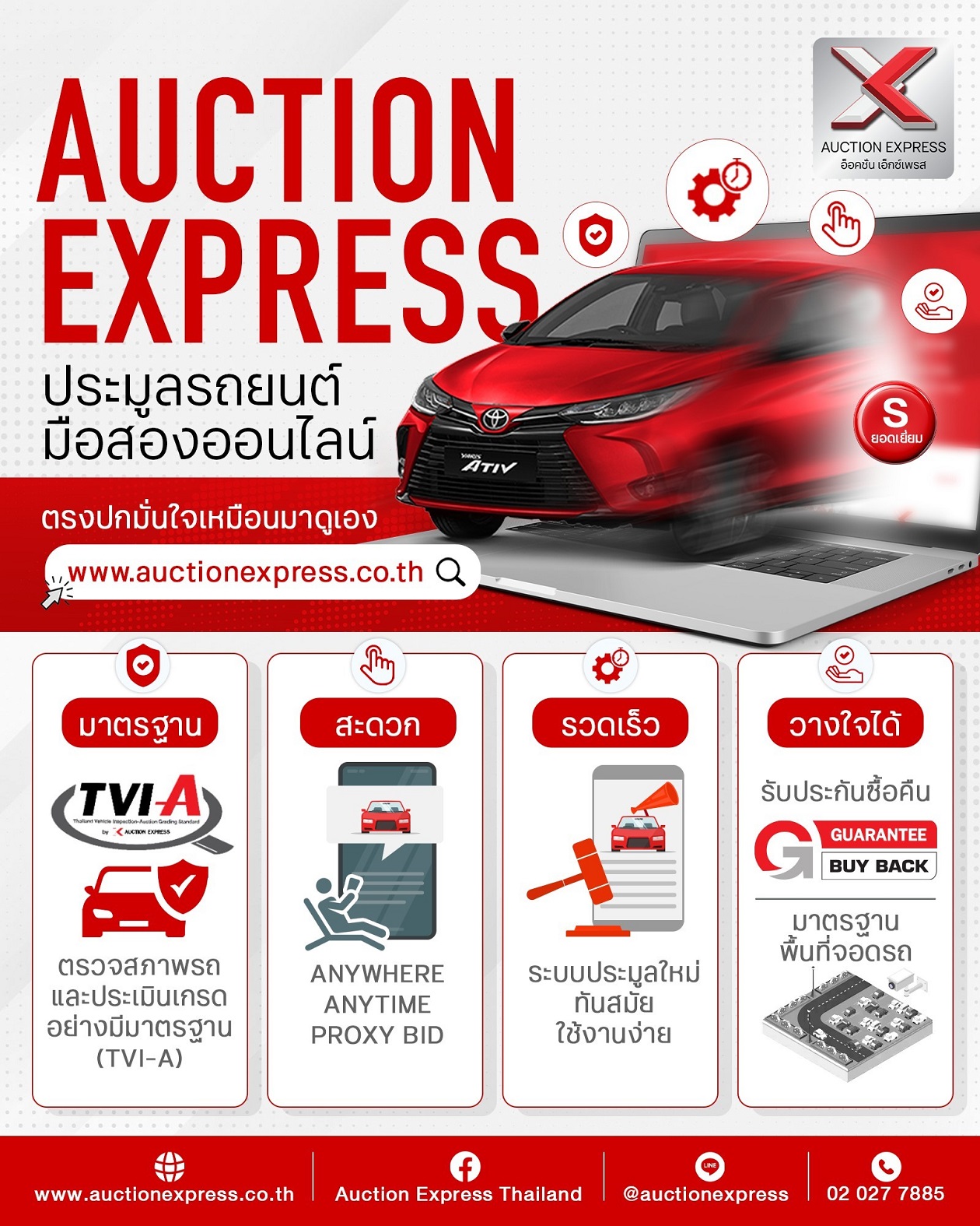 Auction Express เราพร้อมให้บริการด้วยมาตรฐาน ที่มาพร้อมกับความสะดวก รวดเร็ว เพื่อให้ผู้ขายไว้วางใจในการส่งรถเข้าประมูล และผู้ซื้อมั่นใจว่าจะได้รับรถที่มีคุณภาพที่ดี เพื่อให้เรา เป็นที่หนึ่งในใจลูกค้า และเป็นผู้นำขับเคลื่อนวงการประมูลรถยนต์มือสองของไทยให้เติบโตอย่างยั่งยืน