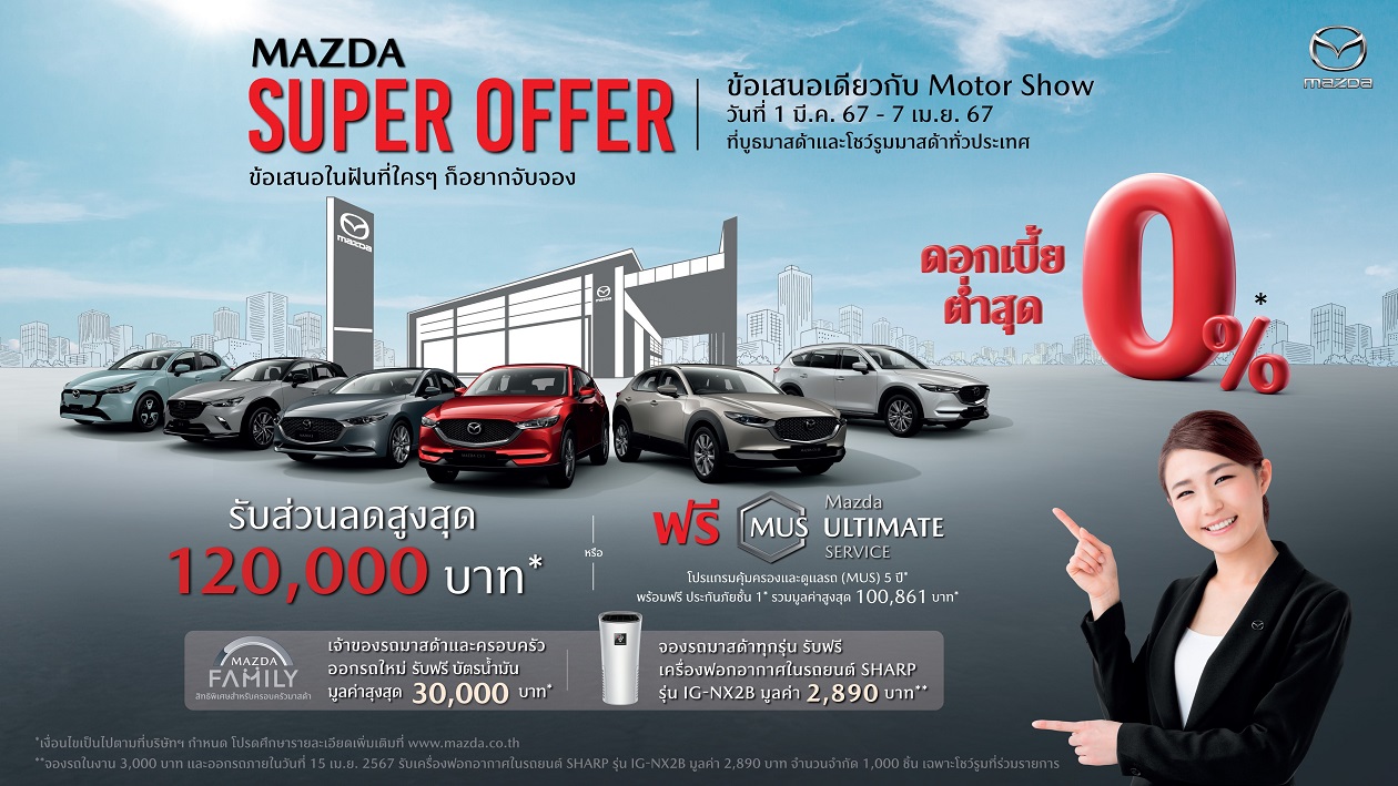ตีเหล็กต้องตีตอนร้อน หลังประสบความสำเร็จอย่างสูงจากแคมเปญ Mazda Season of Luck เมื่อเดือนกุมภาพันธ์ที่ผ่านมา มาสด้าไม่รอช้าอัดข้อเสนอสุดร้อนแรงต่อเนื่องรับเดือนมีนาคม กับแคมเปญ Mazda Super Offer ข้อเสนอในฝันที่ใครๆ ก็อยากจับจอง ซึ่งเป็นข้อเสนอเดียวกับงานมอเตอร์โชว์ รับดอกเบี้ยต่ำสุด 0%* ส่วนลดสูงสุด 120,000 บาท* ฟรีโปรแกรมคุ้มครองและดูแลรถ Mazda Ultimate Service (MUS) 5 ปี* ฟรีประกันภัยชั้น 1 Mazda Premium Insurance รวมมูลค่าสูงสุด 100,861 บาท* เมื่อจองรถมาสด้าทุกรุ่นรับฟรีเครื่องฟอกอากาศในรถยนต์ มูลค่า 2,890 บาท** นอกจากนี้ มาสด้ายังมอบข้อเสนอเพิ่มเติมสำหรับ Mazda Family หรือ เจ้าของรถยนต์มาสด้าและครอบครัว เมื่อออกรถใหม่ รับฟรีบัตรน้ำมันมูลค่าสูงสุด 30,000 บาท* ตั้งแต่วันที่ 1 มี.ค. 67 – 7 เม.ย. 67 ที่โชว์รูมมาสด้าทั่วประเทศและที่บูธมาสด้าในงานมอเตอร์โชว์ที่กำลังจะมาถึงในเร็วๆ นี้