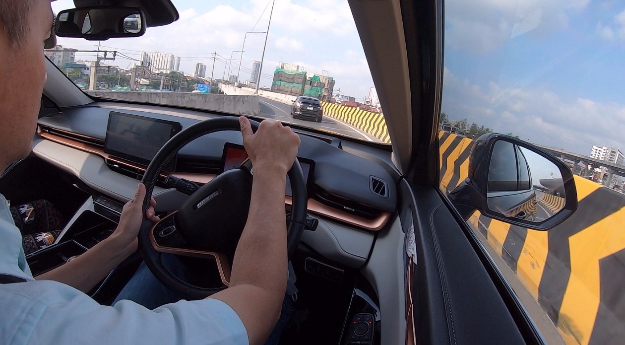 ส่วนฟิลลิ่งของระบบกันสะเทือนโดยเฉพาะด้านหน้ายังให้ความรู้สึกย้วยๆ โยน อยู่บ้าง (ตามสไตล์รถจีน) วิ่งด้วยความเร็วระดับ 120 กม./ชม. ขณะเดินทางถือว่านิ่งพอตัว ขับแล้วไม่เครียด(ยกเว้นลอนถนน หรือคอสะพาน ก็ยกๆ คันเร่งชะลอความเร็วบ้าง) การเข้าโค้งด้วยความเร็วถือว่าให้การทรงตัวที่ดี(แต่อย่าเข้าโค้งแรงเกินไป เพราะอาการหน้ารถอันเดอร์สเตรีย์จะโผล่มาในทันที ส่วนฟิลลิ่งการทำงานของระบบเบรคถือว่ายังคงใกล้เคียงของเดิม ต้องทำความคุ้นเคยกับน้ำหนักของแป้นเบรคสักเล็กน้อย ส่วนเรื่องของการรีเจนไฟในขณะยกคันเร่งนั่น แทบจะไม่รู้สึกว่ารถมีอาการหน่วงเท่าใดนัก ซึ่งจะส่งผลให้การรีชาร์จไฟกลับเข้าไปเก็บที่แบตเตอรี่มีเปอร์เซ็นต์ที่น้อยลง