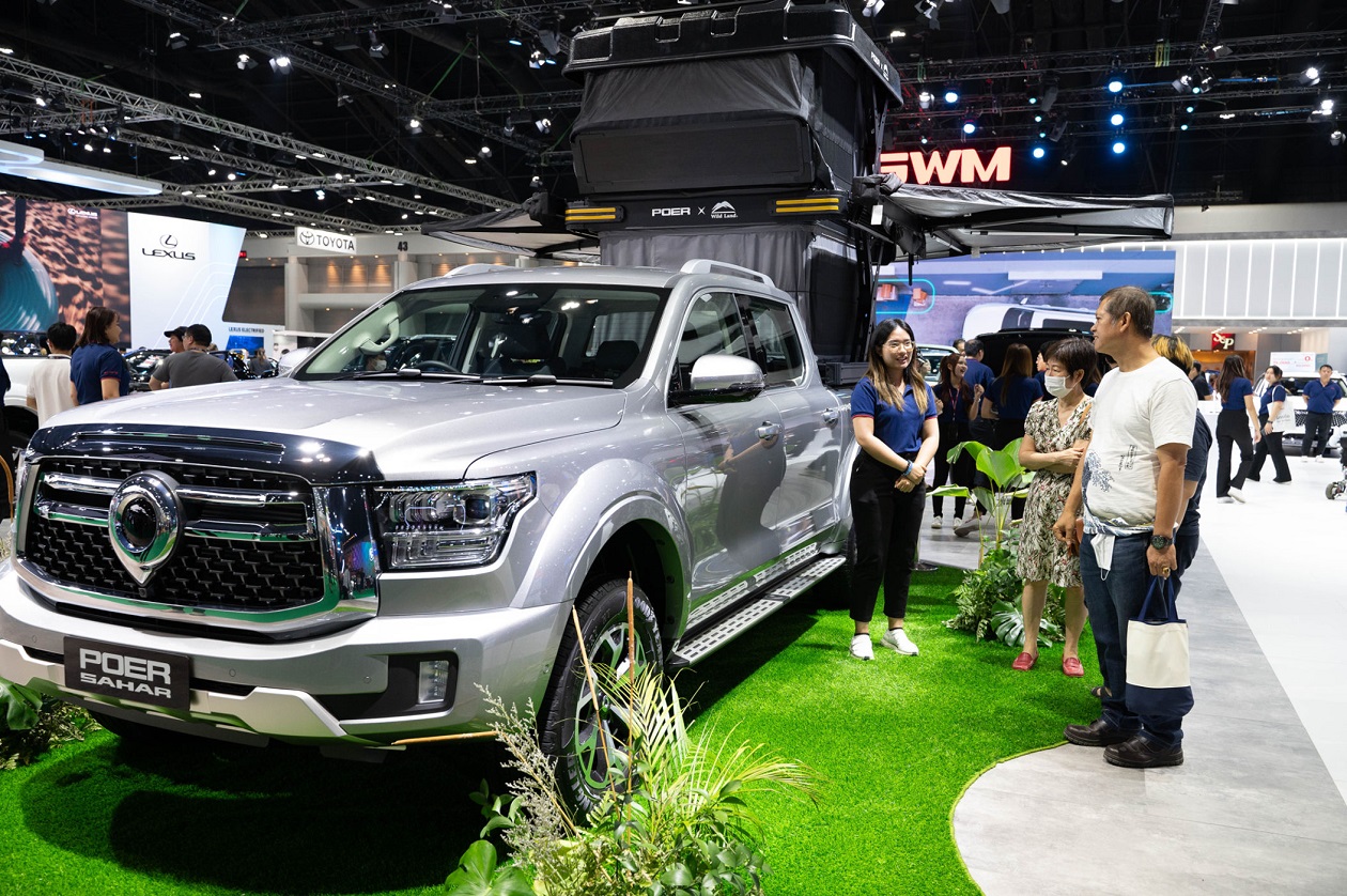 ภายในงานมอเตอร์โชว์ครั้งนี้ เกรท วอลล์ มอเตอร์ สร้างสีสันเขย่าวงการยานยนต์พลังงานไฟฟ้าไทย เอาใจแฟน ๆ ชาวไทยด้วยการเผยโฉมรถกระบะพลังงานไฮบริดรุ่นแรกในประเทศ GWM POER SAHAR HEV ให้สัมผัสอย่างใกล้ชิด ด้วยดีไซน์ที่โดดเด่นไม่ซ้ำใคร ผสานความแข็งแกร่งอย่างทรงพลัง ความหรูหราเหนือระดับ ความล้ำสมัยเหนือจินตนาการ ร่วมด้วยการออกแบบทั้งภายนอกและภายในที่มีความประณีต ห้องโดยสารที่มีความกว้างขวาง อัดแน่นด้วยฟังก์ชันล้ำสมัย ไม่ว่าจะเป็นฝากระบะท้ายที่เปิด-ปิดได้ 2 รูปแบบ หรือเบาะผู้โดยสารด้านหลังสามารถปรับเอนได้เพื่อความสะดวกสบาย รถยนต์คันนี้จะเข้ามาเปลี่ยนภาพลักษณ์รถกระบะในประเทศไทยให้ไม่เหมือนเดิม