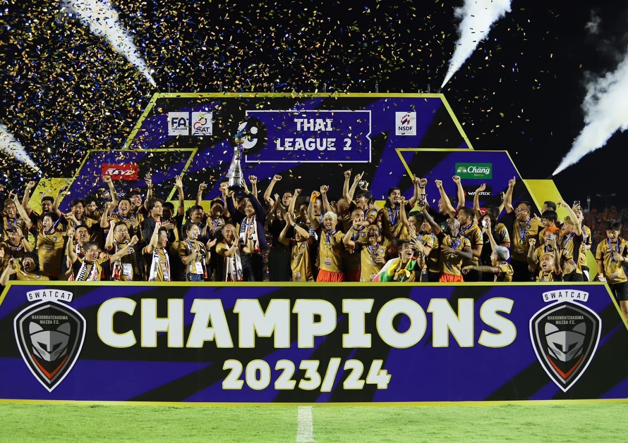 สนามกีฬาเฉลิมพระเกียรติ 80 พรรษา, จังหวัดนครราชสีมา, 24 เมษายน 2567 – หลังจากมาสด้าประกาศหนุนสวาทแคทต่อเนื่องเป็นปีที่ 12 เพื่อลงสู้ศึกไทยลีก 2 ตลอดฤดูกาลนี้ เพราะมาสด้ายังคงเชื่อมั่นในสปิริตความเป็นนักสู้ของทีม ส่งผลให้แมตช์ก่อนสุดท้ายที่เดิมพันด้วยตำแหน่งแชมป์ เจ้าแมวพิฆาตก็ไม่ทำให้แฟนบอลชาวโคราชผิดหวัง ด้วยการเปิดบ้านเอาชนะทีมหนองบัว พิชญ คู่แข่งสำคัญที่กำลังเบียดกันลุ้นแชมป์ไปสุดมัน 3-0 ผงาดคว้าแชมป์ ครองความยิ่งใหญ่ท่ามกลางแฟนบอลเข้าชมเต็มสนามกว่า 25,000 คน ที่เดินทางมาให้กำลังใจกันอย่างล้นหลาม พร้อมกลับขึ้นสู่ไทยลีกอีกครั้งในฤดูกาลหน้า