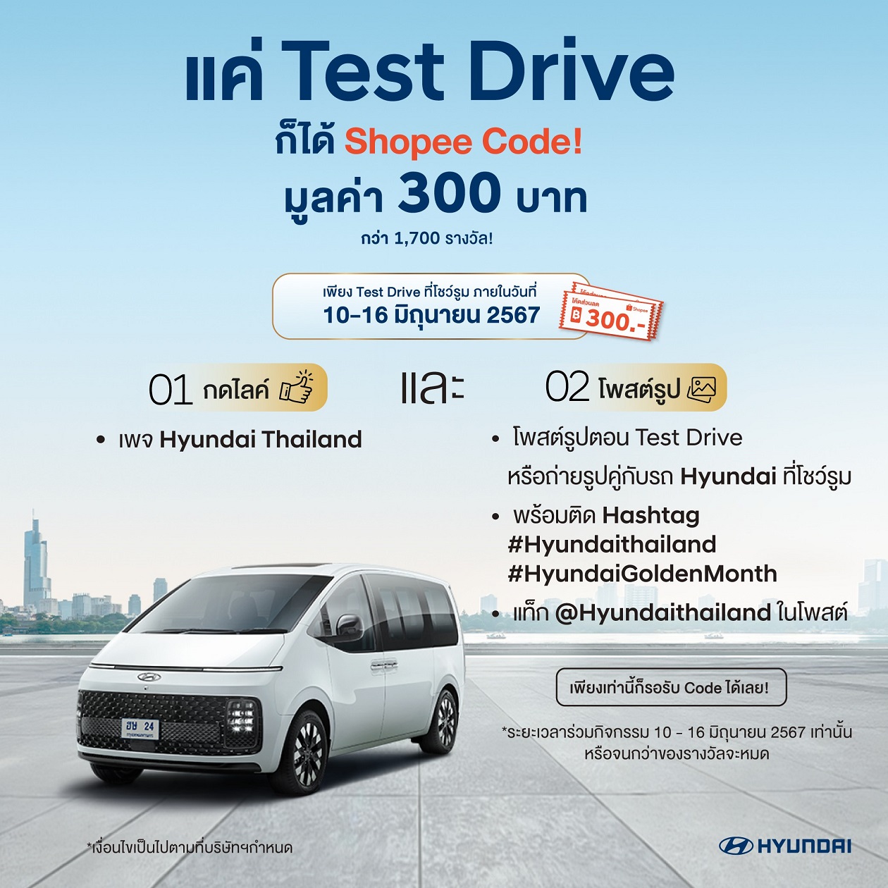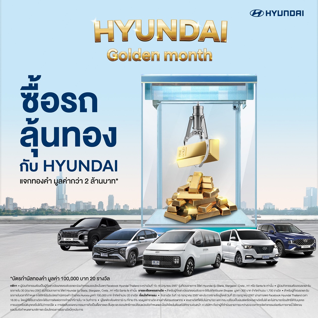 Hyundai Golden Month กิจกรรมสุดพิเศษที่ ฮุนได โมบิลิตี้ ประเทศไทย จัดขึ้นเพื่อตอบแทนลูกค้าชาวไทย เพียงทดลองขับรถยนต์ฮุนไดที่โชว์รูมฮุนไดสาขาใดก็ได้ ระหว่างวันที่ 10 – 16 มิถุนายน 2567 รับรหัสคูปอง Shopee มูลค่า 300 บาท จำนวนจำกัด 1,700 ใบ1 สำหรับผู้ที่จองและรับรถยนต์ฮุนไดรุ่น Staria, Stargazer, Creta, H1 หรือ Santa Fe ภายในวันที่ 30 มิถุนายน 2567 มีสิทธิ์ลุ้นรับบัตรกำนัล Aurora มูลค่า 100,000 บาท จำนวน 20 รางวัล1 รวมจำนวนของรางวัลทั้งหมด 1,720 รางวัล มูลค่ารวมกันทั้งสิ้นกว่า 2,510,000 บาท