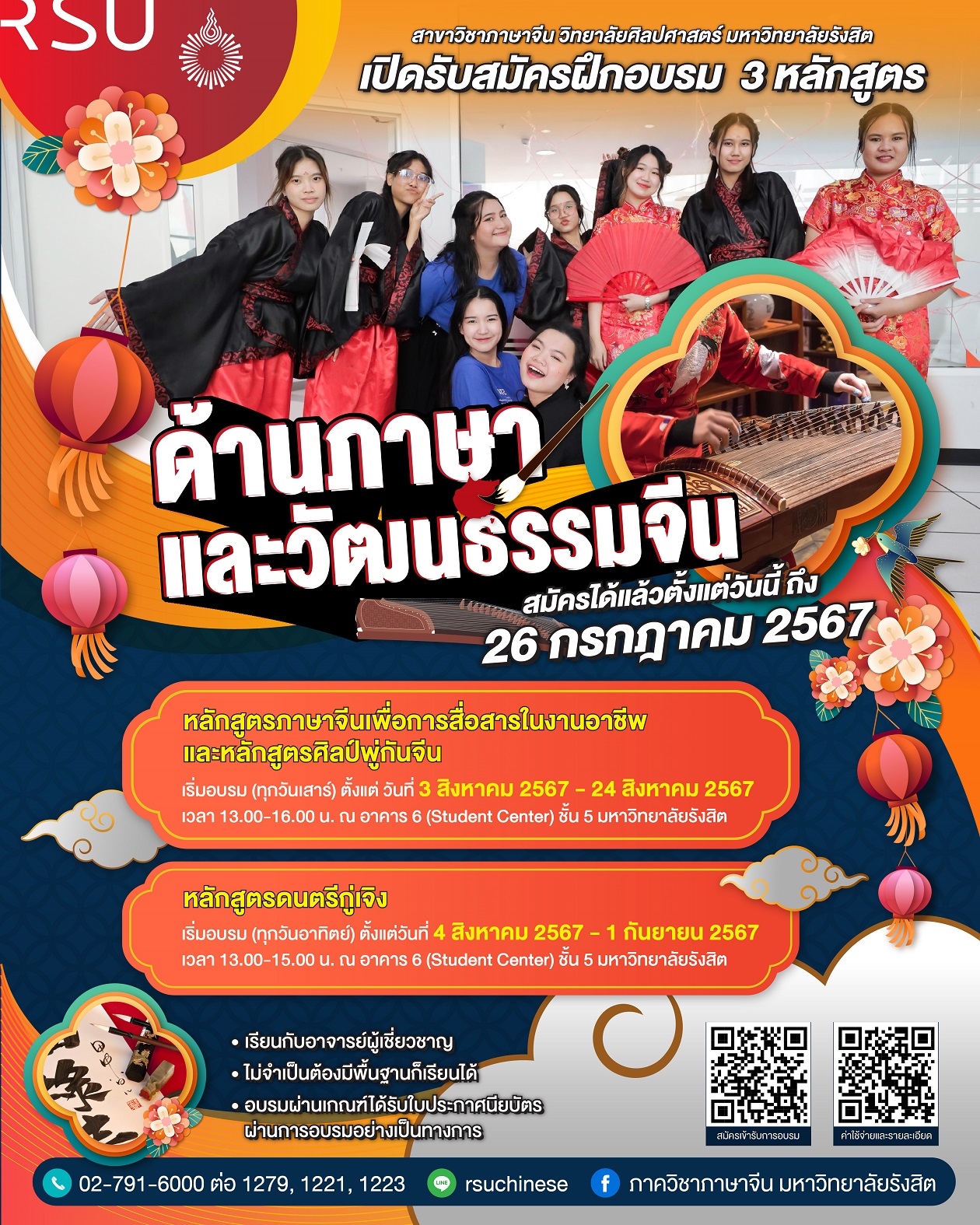 สาขาวิชาภาษาจีน วิทยาลัยศิลปศาสตร์ มหาวิทยาลัยรังสิต จัดอบรม 3 หลักสูตรด้านภาษาและวัฒนธรรมจีน ได้แก่ หลักสูตรภาษาจีนเพื่อการสื่อสารในงานอาชีพ หลักสูตรศิลป์พู่กันจีน และหลักสูตรดนตรีกู่เจิง โดยเปิดรับสมัครแล้วตั้งแต่วันนี้ – 26 กรกฎาคม 2567